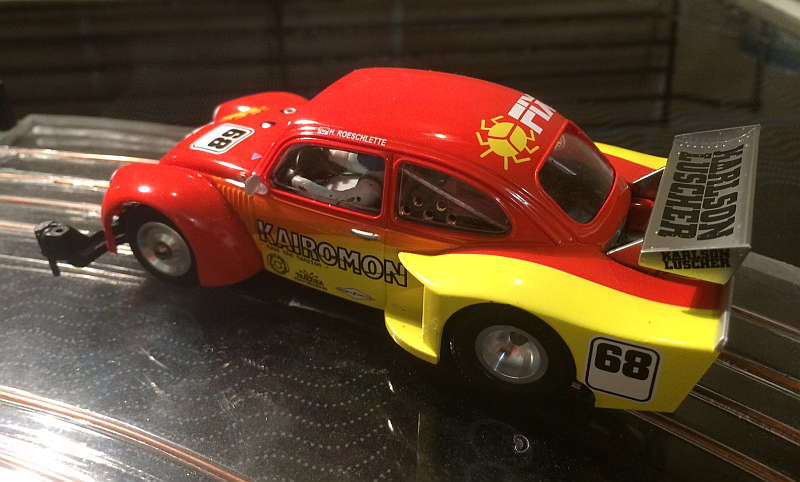 ich poste ja eher selten meine Umbauten, aber dieses Exemplar war doch etwas aufwändiger, das wollte ich euch nicht vorenthalten. Als Carrera vor rund 2 Jahren das Fantasiemodell VW Käfer Gruppe 5 rausbrachte, wusste ich sofort, dass ich die Kiste haben musste. Ernüchterung stellte sich aber schnell ein, als ich das Teil dann in Händen hielt: Die Karosse war an den vorderen Kotflügeln gerade mal 3,5cm breit, da haben manche Servo-Originalkarossen fast das doppelte...