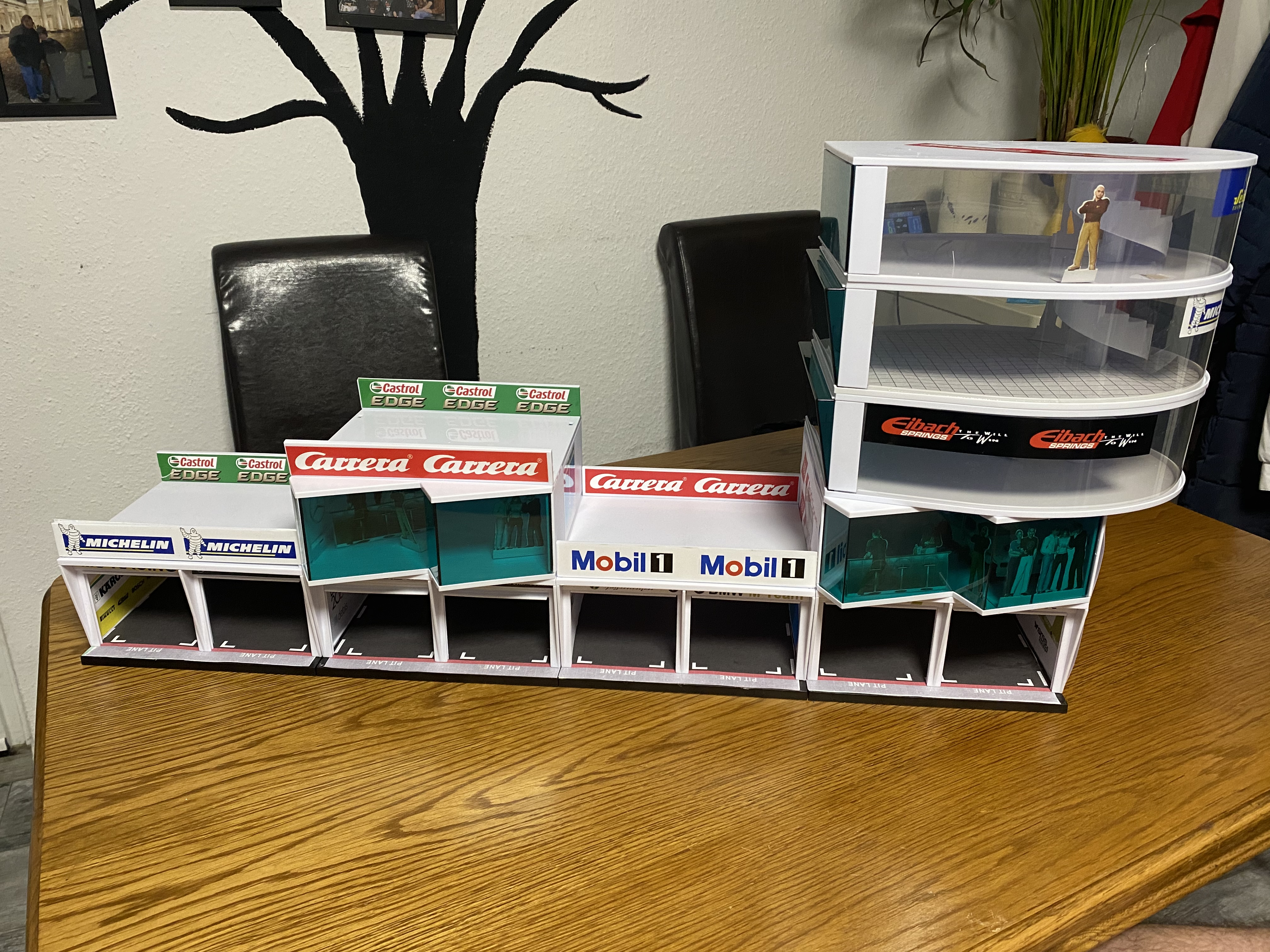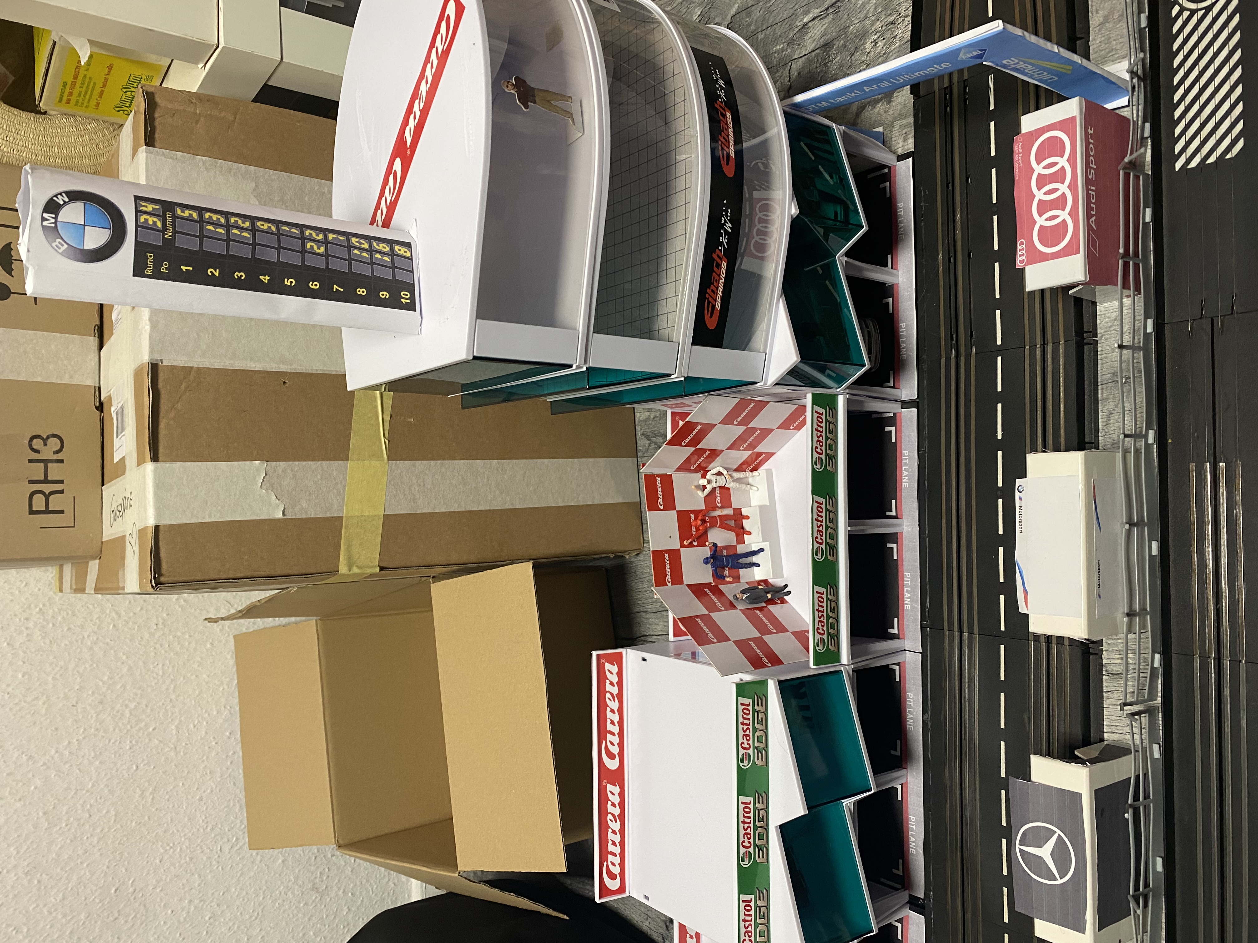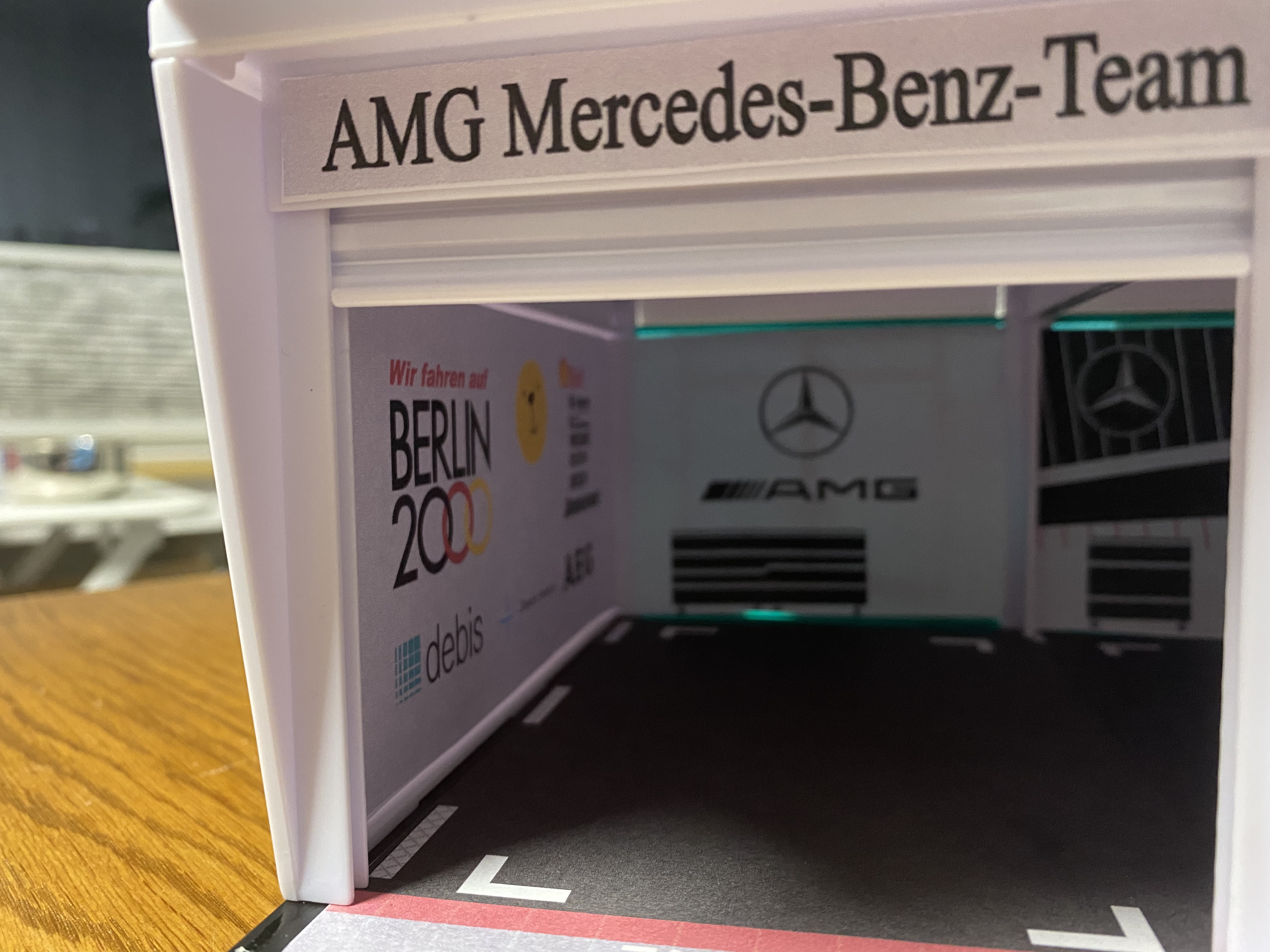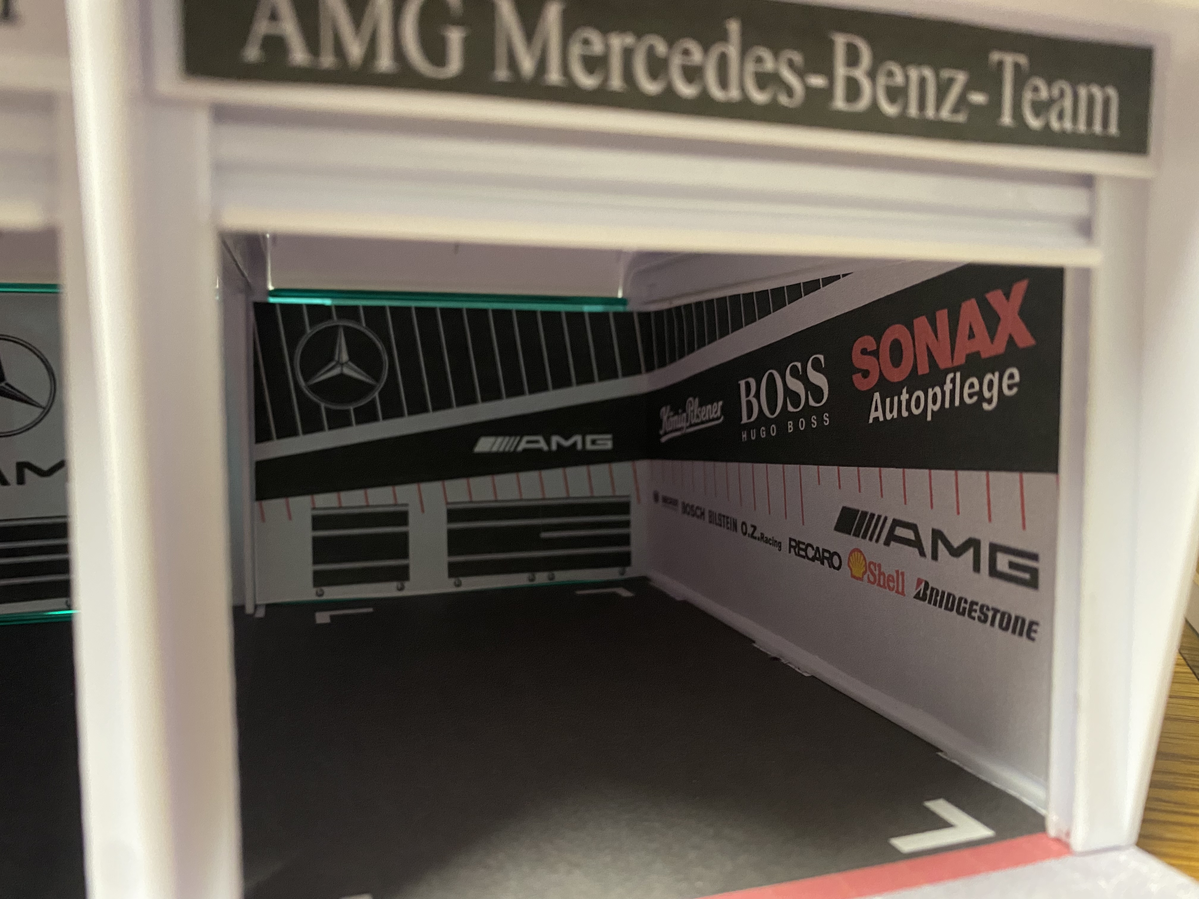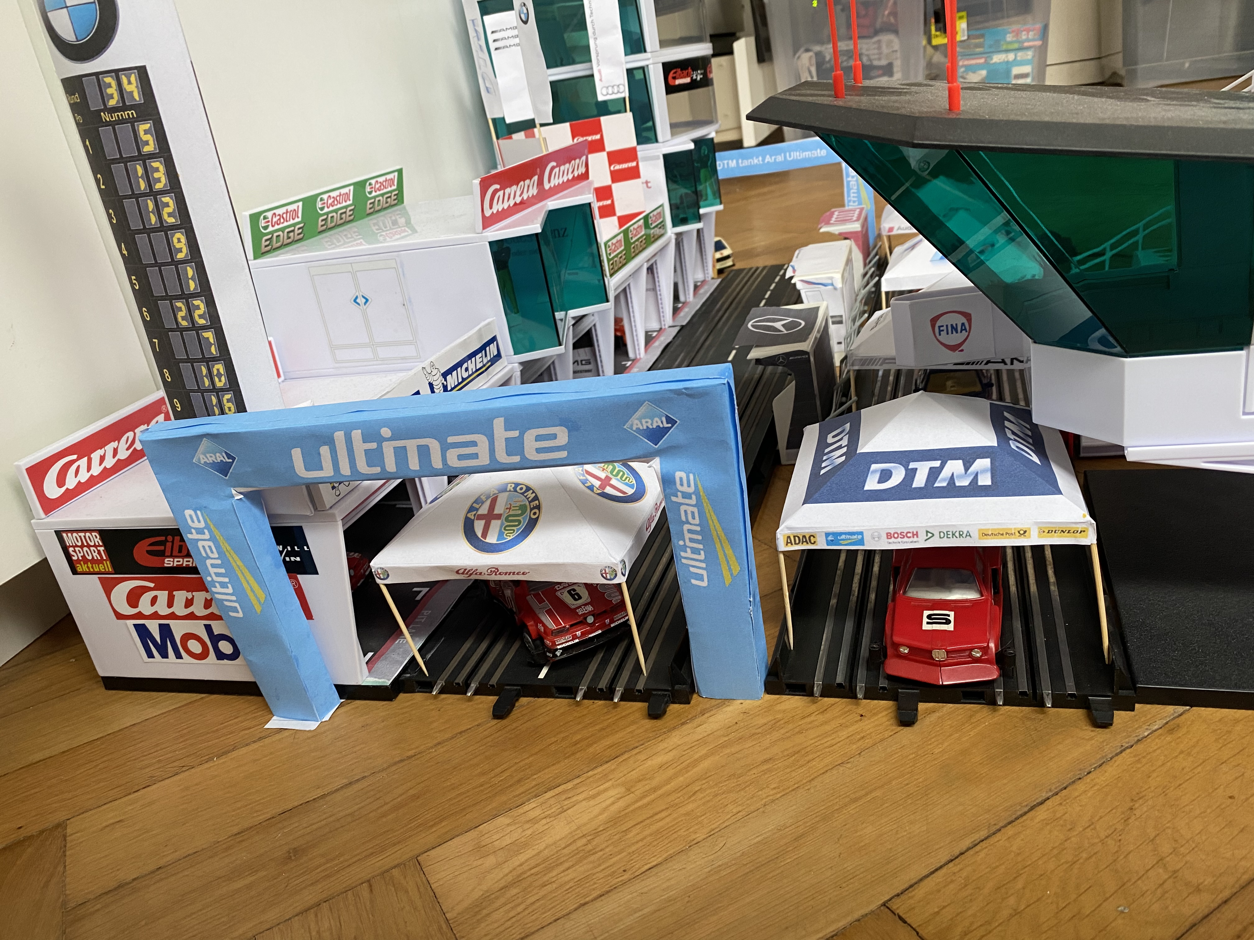 Moin gemeinde. Neue Sachen sind eingetroffen , meine Boxengasse wäre dann schon mal Ready, Turm wird aber noch ausgeschmückt innerlich und bastel noch an Antennen für die TV Anstalten , ebenfalls neu dazu gesellt sich nun Hans Werner Aufrecht (R.I.P.) mit dem HWA Mercedes und dem AMG Mercedes Team von Norbert Haug