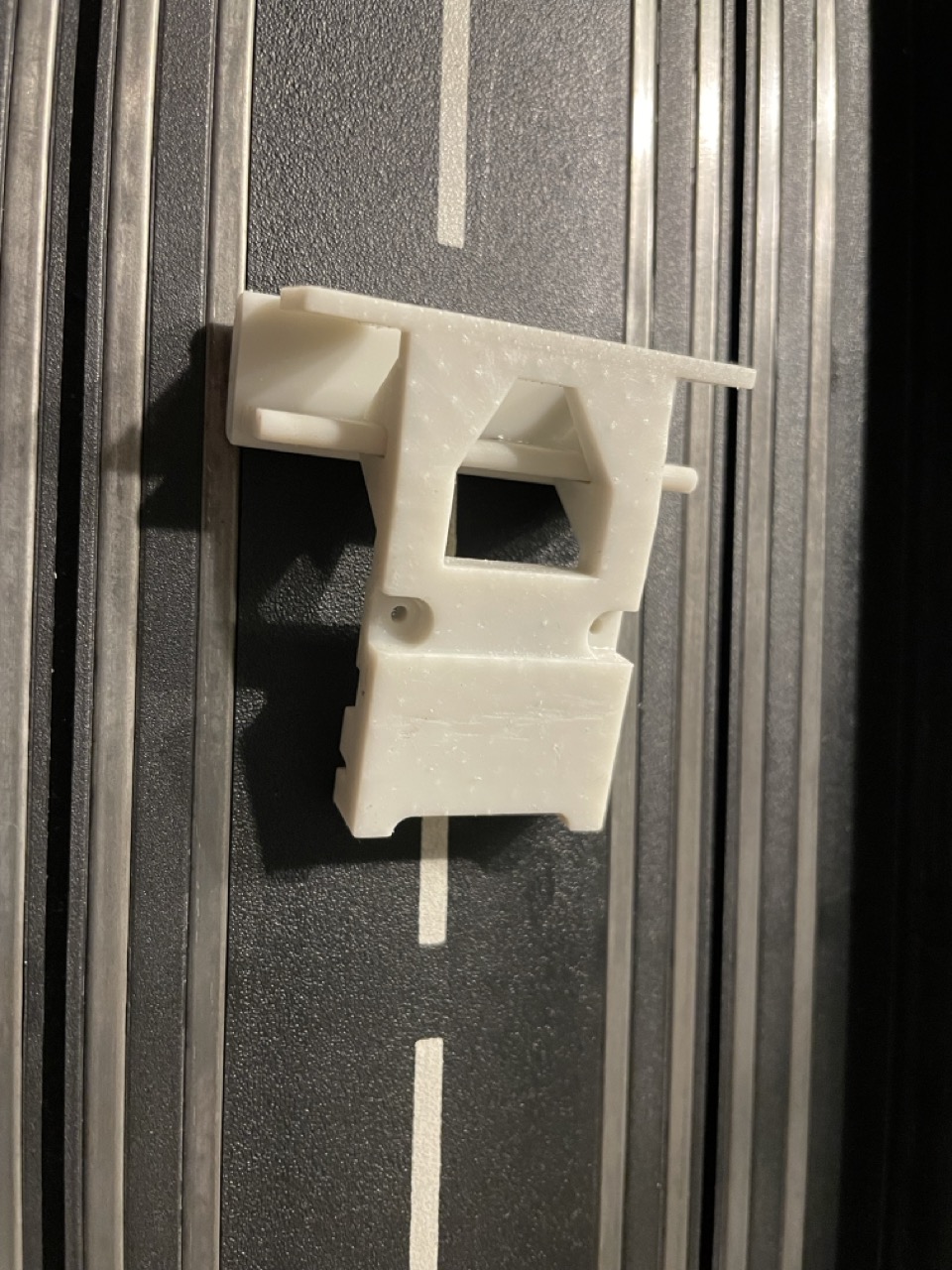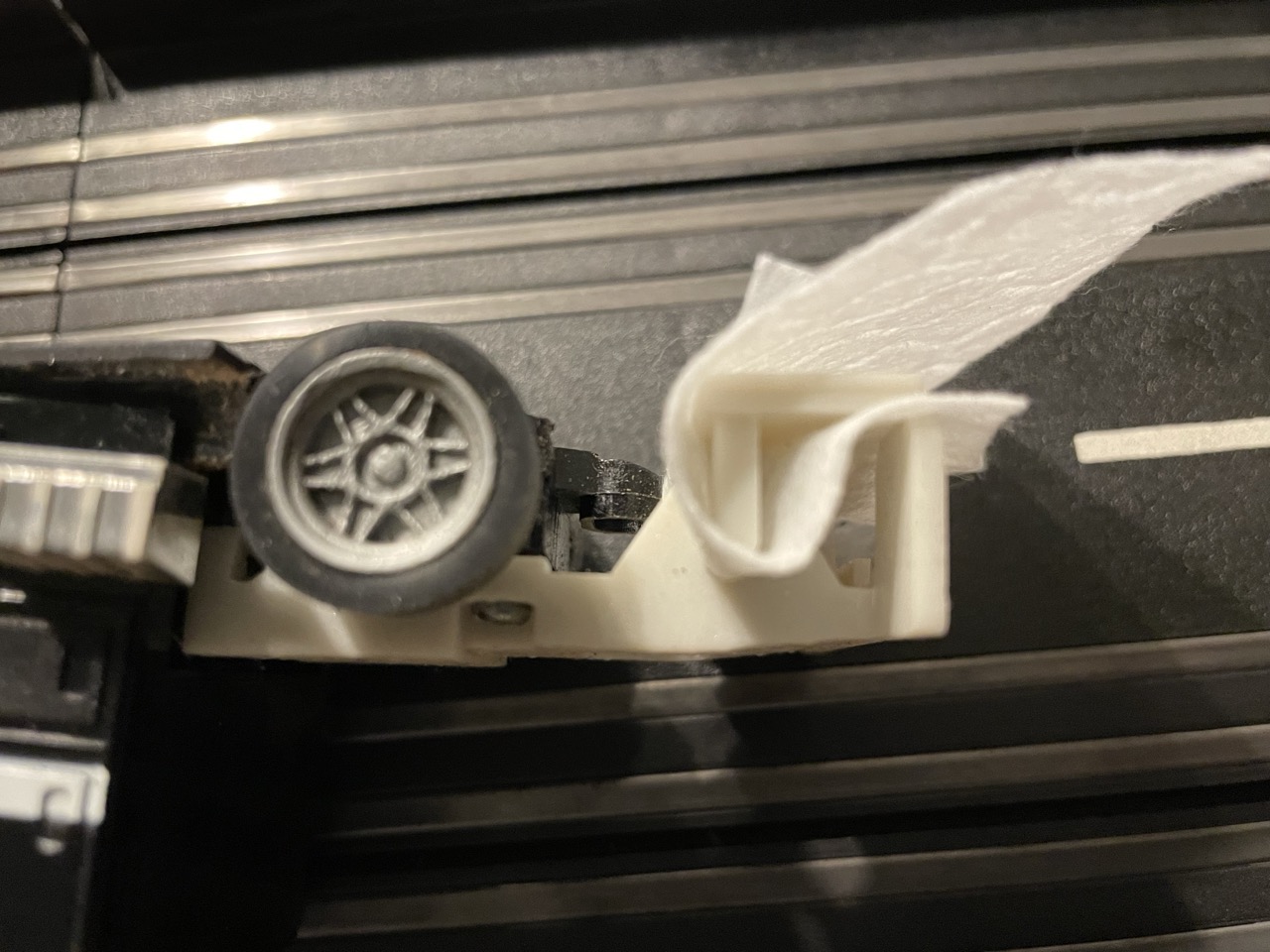 Das Heck, umgebaut, um ein Staubtuch zu klemmen, mit dem sich die Bahn mit ein paar gefahrenen Runden abstauben lässt. Statt der zusätzlichen Achse gibt es ein T-förmiges Bettchen, mit dem man ein zugeschnittenes Staubtuch klemmen kann. Für mehr Fahrspaß auf einer nicht mehr ganz so staubigen Bahn!