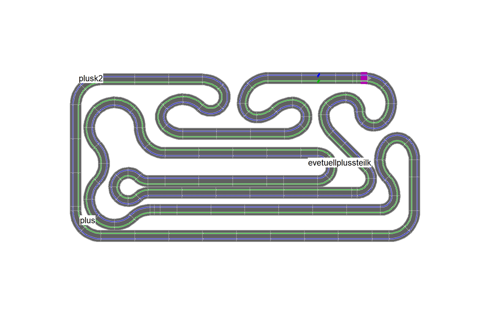 Hi, ich finde es cool mal was anderes auszuprobieren, die Kurven oben haben was. Aber passt das dann noch mit der zweiten Anschlussschiene für Fahrer B? Wäre ja irgendwie blöd wenn der Steckplatz hinter dem Fangzaun liegen würde.