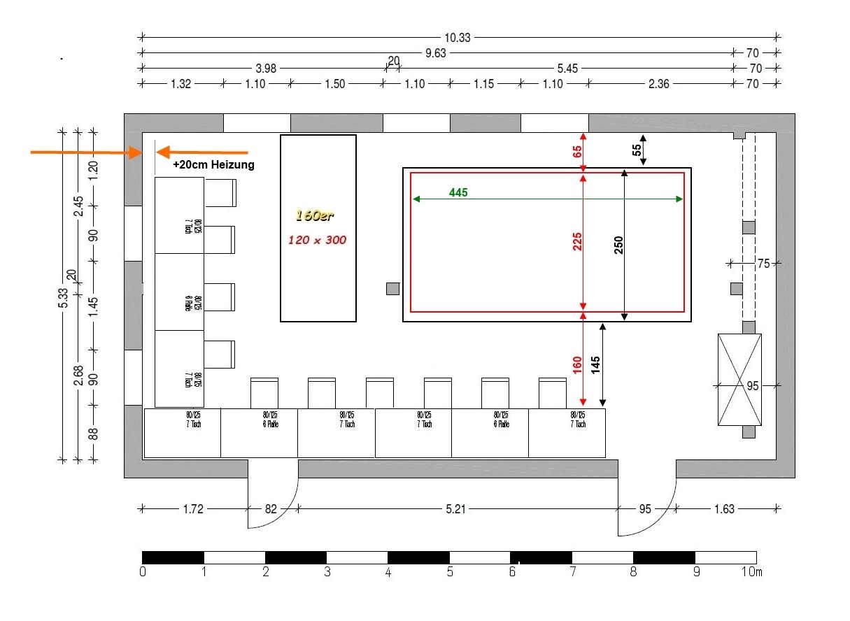 ...denke das wird zu eng...Heizungen sind links an der Wand...Tische stehen da nicht ganz an der Wand. :?