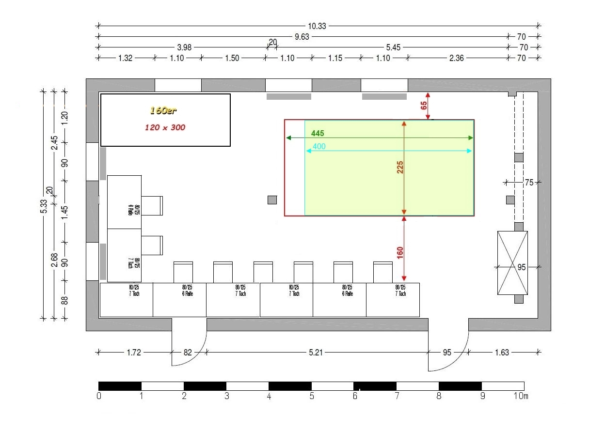 wie wäre es denn die Basteltische wie gaaaaaaaaaanz früher an die obere Fensterfront und um die Ecke bis zum Schrank zu stellen. Die Platte der 140er um 90° drehen und in den Raum links vom Pfeiler und die 160er parallel rechts vom Pfeiler an der unteren Wand?