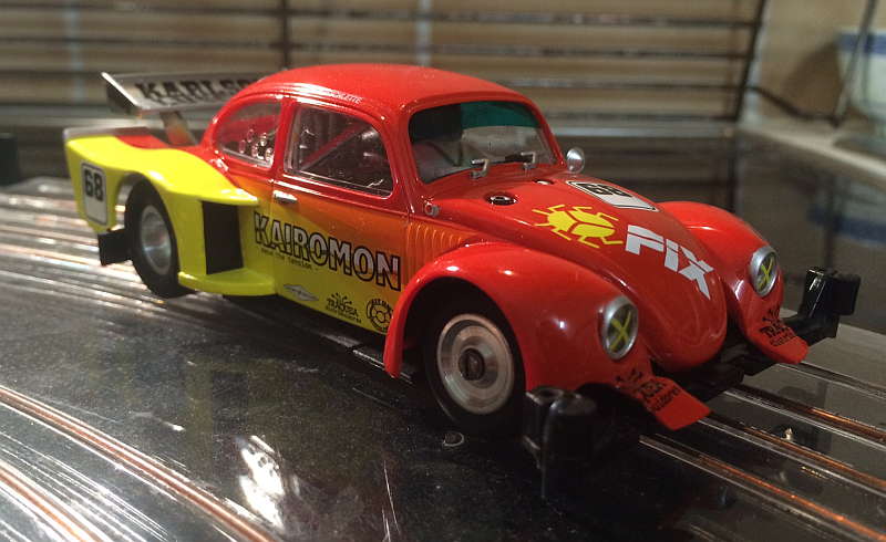 ich poste ja eher selten meine Umbauten, aber dieses Exemplar war doch etwas aufwändiger, das wollte ich euch nicht vorenthalten. Als Carrera vor rund 2 Jahren das Fantasiemodell VW Käfer Gruppe 5 rausbrachte, wusste ich sofort, dass ich die Kiste haben musste. Ernüchterung stellte sich aber schnell ein, als ich das Teil dann in Händen hielt: Die Karosse war an den vorderen Kotflügeln gerade mal 3,5cm breit, da haben manche Servo-Originalkarossen fast das doppelte...
