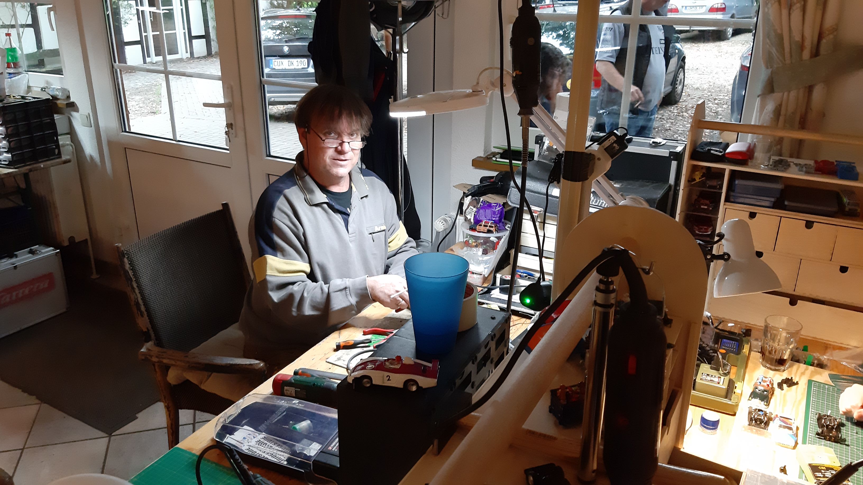Um Basteleirückstände auf den vorhandenen Tischen zu vermeiden, wäre es gut, wenn alle Bastler sich eine entsprechende Unterlage mitbringen könnten (z.B. ein Brett oder Pappe auf dem man löten, kleben, dremeln und lackieren kann.)