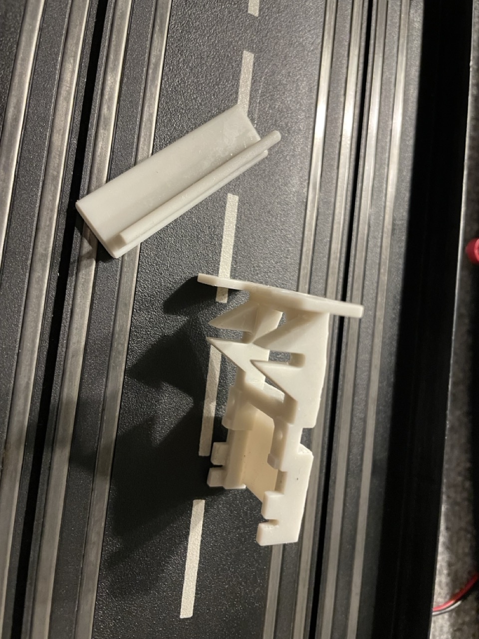 Das Heck, umgebaut, um ein Staubtuch zu klemmen, mit dem sich die Bahn mit ein paar gefahrenen Runden abstauben lässt. Statt der zusätzlichen Achse gibt es ein T-förmiges Bettchen, mit dem man ein zugeschnittenes Staubtuch klemmen kann. Für mehr Fahrspaß auf einer nicht mehr ganz so staubigen Bahn!