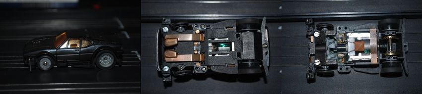 Bei den ersten Chassis wurden die Karossen aufgeklemmt, die Motoren waren offen (sog. Teilemotor) und die Chassis hatten keine seitlichen Flügel, hier ein Porsche 936 Jägermeister: Danach wurde seitens Carrera wohl registriert, dass die Chassis zum Teil in den Innenkurven mit den Hinterreifen auf den Innenführungen aufsitzen und abfliegen. Die nächsten Chassis hatten dann jedenfalls Flügel, hier ein Lola: Danach kamen dann irgendwann die Schraubkarossen und die Blockmotoren, z. B. der BMW M1: Von allen Varianten gibt es sowohl Kurz-(bzw. Normal-) als auch Langchassis. Hier ein Langchassis, BMW 633, Klemmkarosse, aber schon Blockmotor, außerdem mit Licht: Bei den Lenkungen gibt es zwei verschiedene Varianten. Die „normale“ (links im Bild) und die sog. Spreizfederlenkung (rechts, bei den neuesten Schraubkarossen): Eine gute Seite mit weiteren Beschreibungen, Fahrzeugen, Grundpackungen etc. gibt es hier: