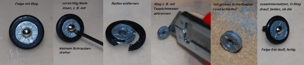 Bei Felgen mit Steg muss zuerst der Steg abgeschnitten werden (z. B. mit Teppichmesser, Cutter), danach mit groben Schleifpapier rund schleifen und O-Ringe 6,5x2mm aufklemmen. Durch das aufrauhen mit dem groben Schleifpapier halten die O-Ringe ohne kleben recht gut. Hinterreifen: