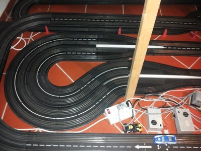 Die Schikane ist eigentlich nur die 2-auf-4-spurige Schikane mit schmalen Leitern (mit breiten Leitern existiert sie ja nicht). Die sollte für wenig Geld zu haben sein und funktioniert sehr gut. Kontakt ist eigentlich trotz der schmalen Leiter kein Problem, aber sie wölbt sich in der Mitte nach oben, deshalb setzen gern Autos auf. Ich suche noch nach einer Lösung. Die anderen Fahrbahnteile sind alle Standard - man muss halt ein paar auserwählen, bei denen man die Zapfen mit einer Zange plattdrückt, dann passen sie mit der Schikane zusammen. Die offizielle Kombinationsfahrbahn ist unnötig.