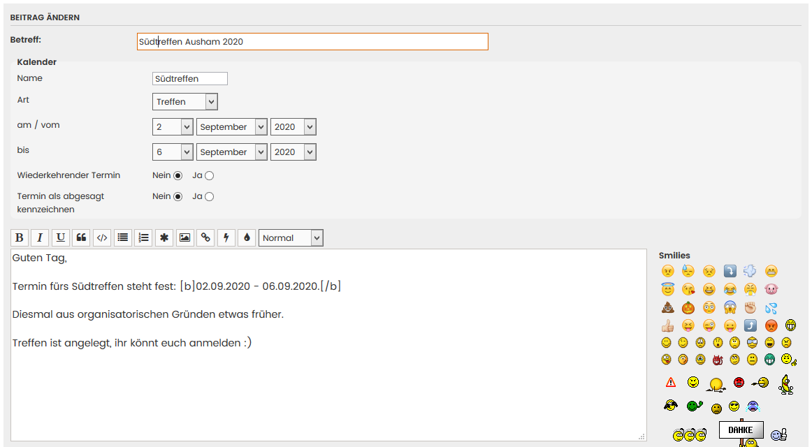 Ab jetzt kann _jeder_, der im Unterforum "Treffen" einen Thread erstellt, ein Treffen im Kalender anlegen. Die Felder dafür werden oberhalb des Textfelds angezeigt: