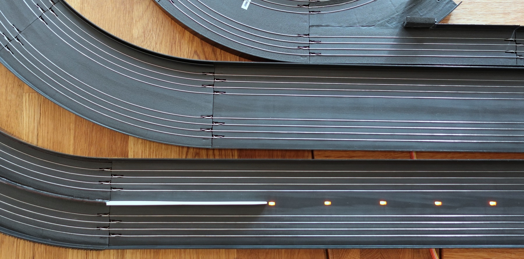 Nach den orangenen LEDs kommt dann eine Mittelplanke von der Schikane, die schmal und niedrig anfängt, und dann in der Höhe abgerudet höher wird und auch breiter. Damit heben die Autos im Fall der Fälle nach oben ab, anstatt frontal in die Mauer zu knallen.