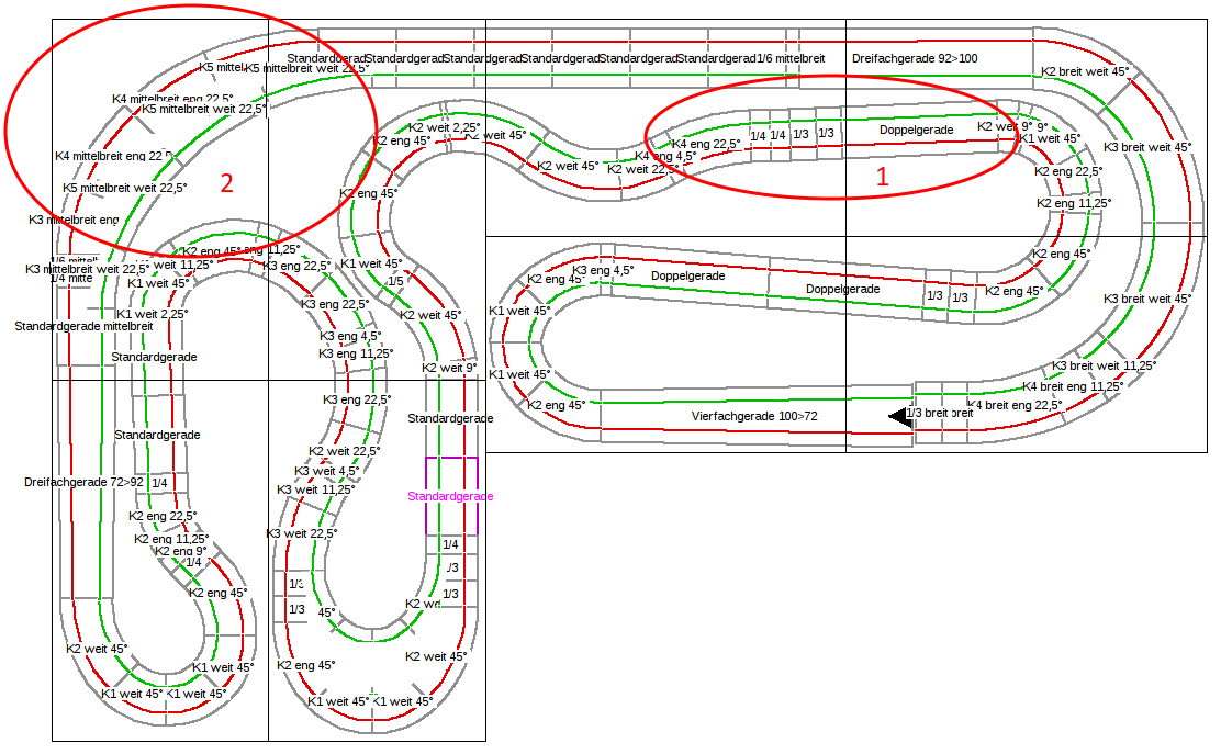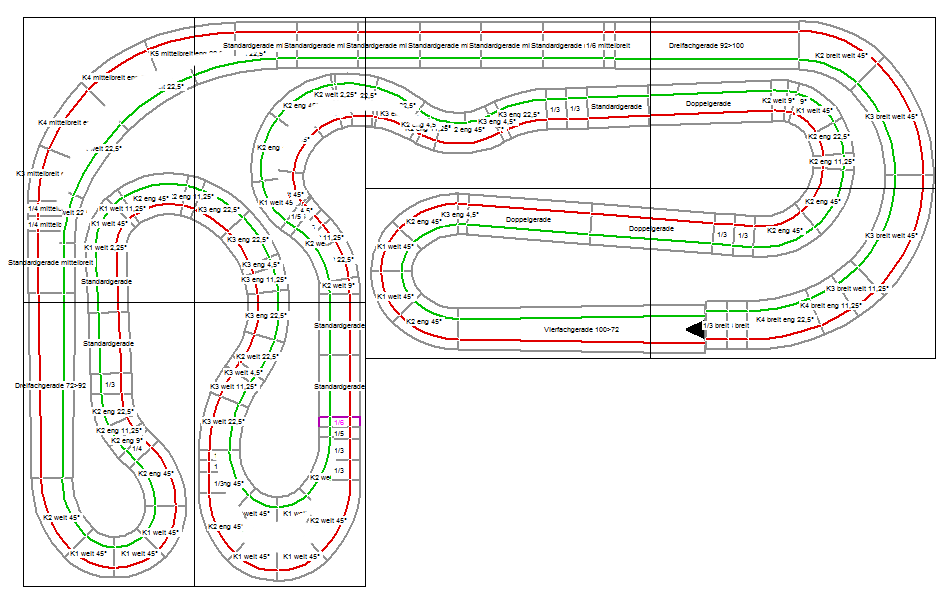 Was meinst du mit "Radius gleichmäßig enger machen"? Noch kürzer würde ich die nicht machen, der Fahrer auf der grünen Spur hat sowieso schon einen Vorteil, weil er durch die obere Kurve schneller kommt. Die Außenkurve an der Stelle bekommt aber nur einen gleichmäßigen Radius, wird also ohnehin noch etwas weiter. Hab ich auf dem Plan nicht drin.