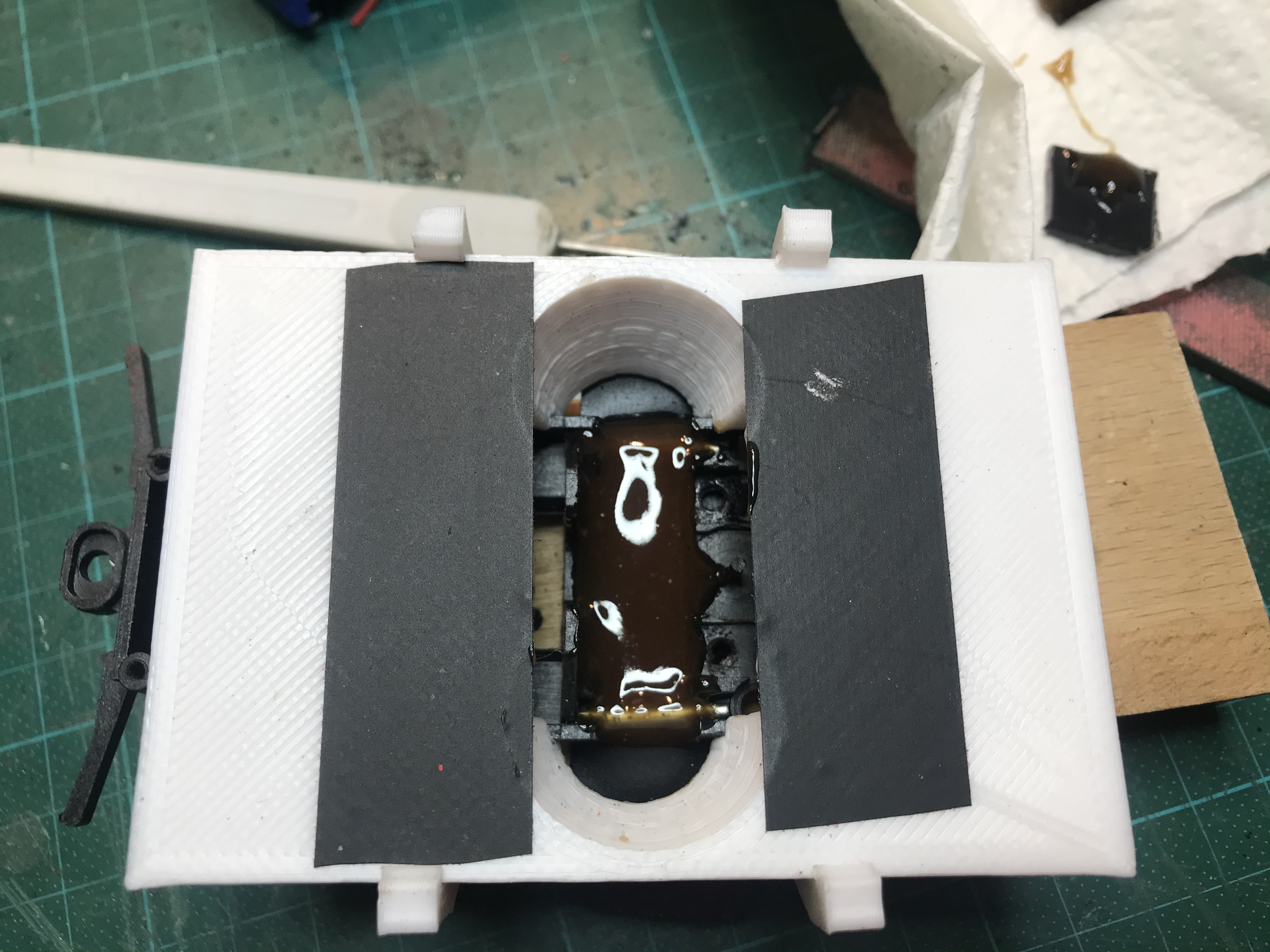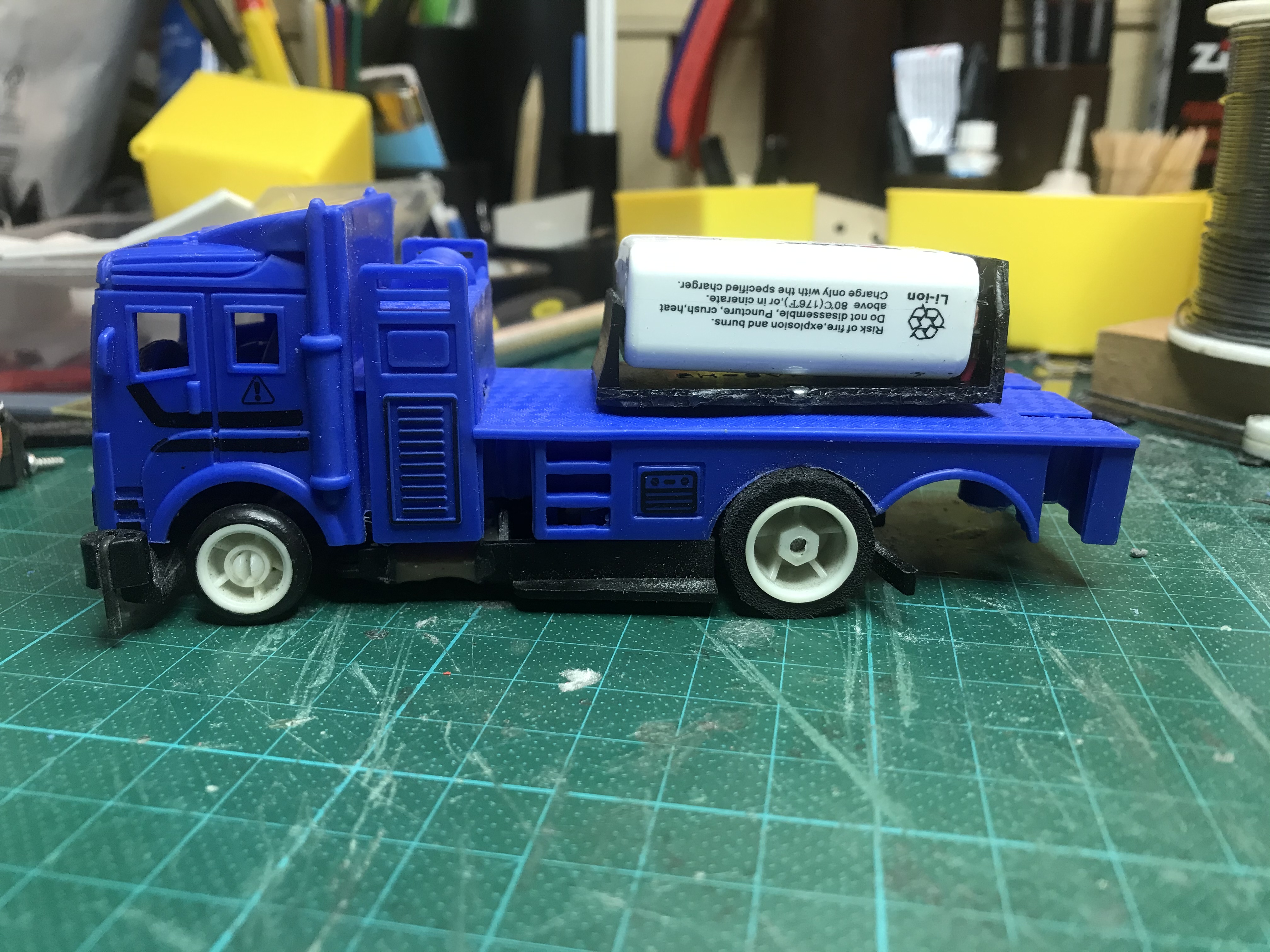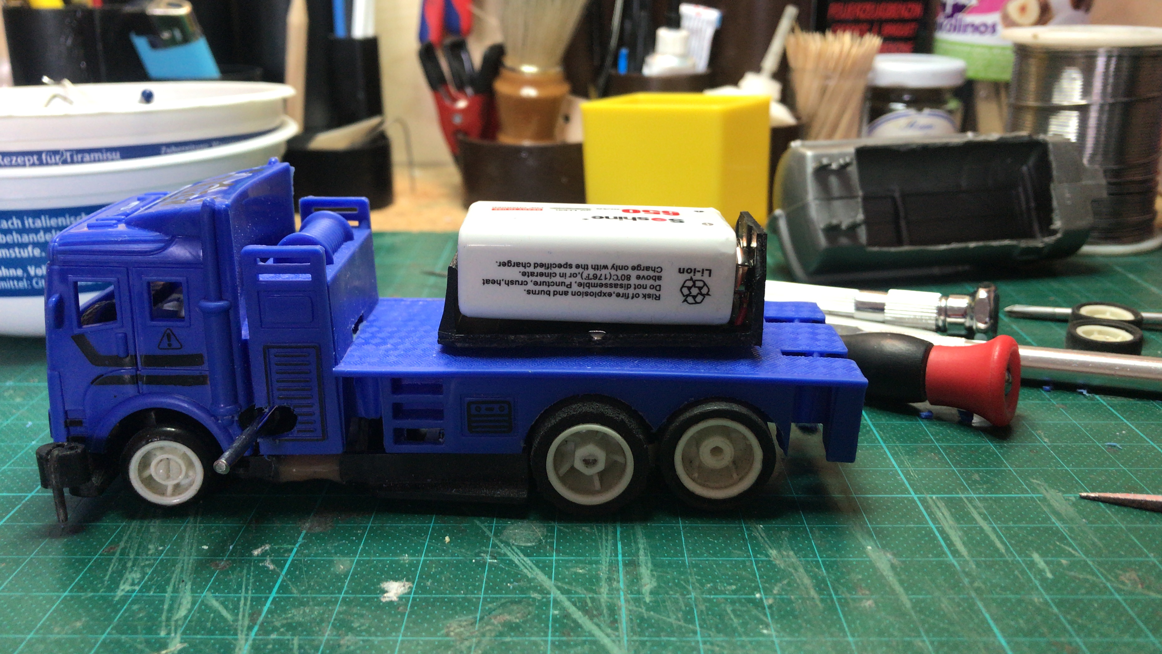 Viel Kleinkram gebastelt ! Batteriehalterung schmäler gemacht , Schalter angebracht , die Lenkmechanik stundenlang optimiert und mit Neodym Magneten funktionierend gemacht... und soweiter
