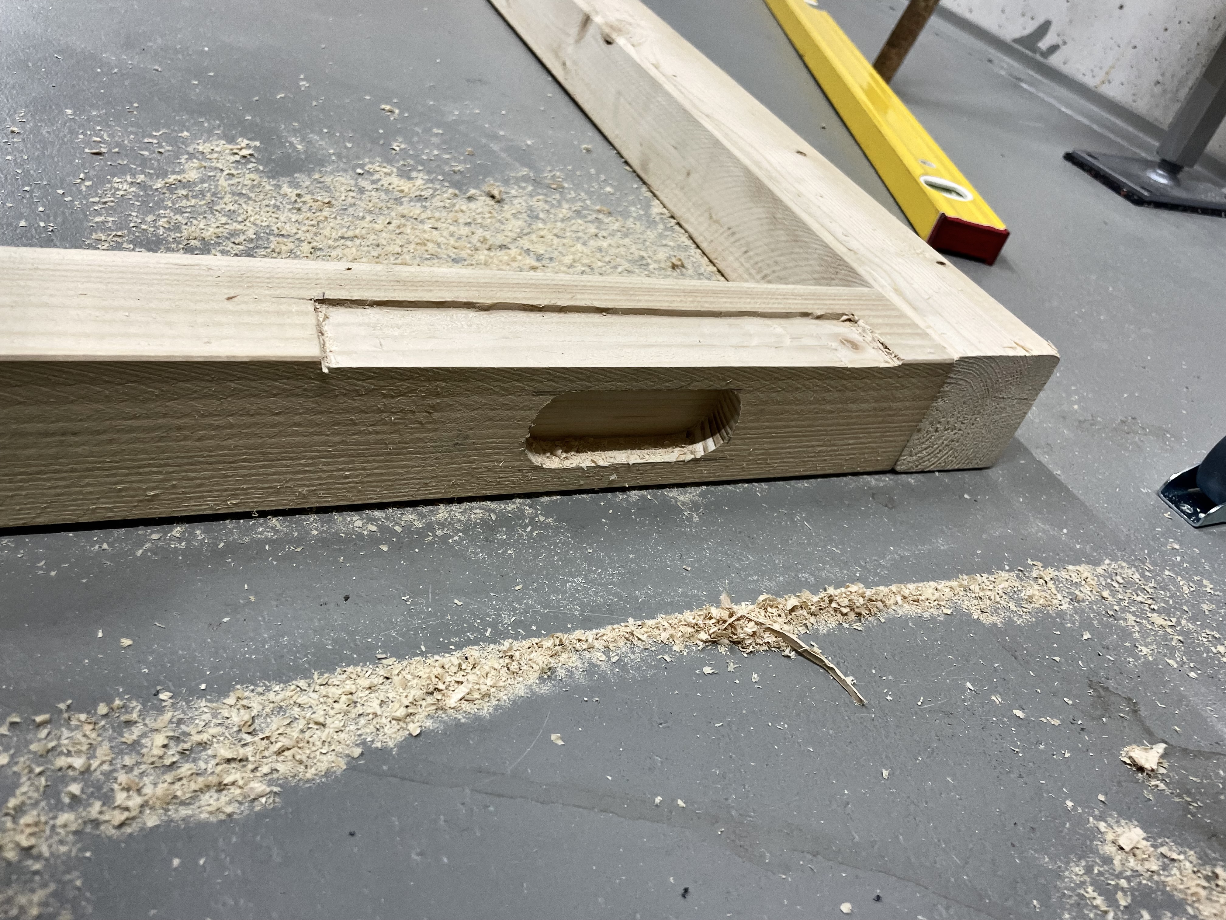 - also Längslöcher in den Rahmen, zwischen Platte und Gestellt ausgefräst, mit einer Metallplatte verstärkt und Rollen an der Wandseite eingearbeitet. Beim Hochklappen rutscht die Platte dank Längslöcher nach unten und geht oben an den Lampen vorbei - wohoo!