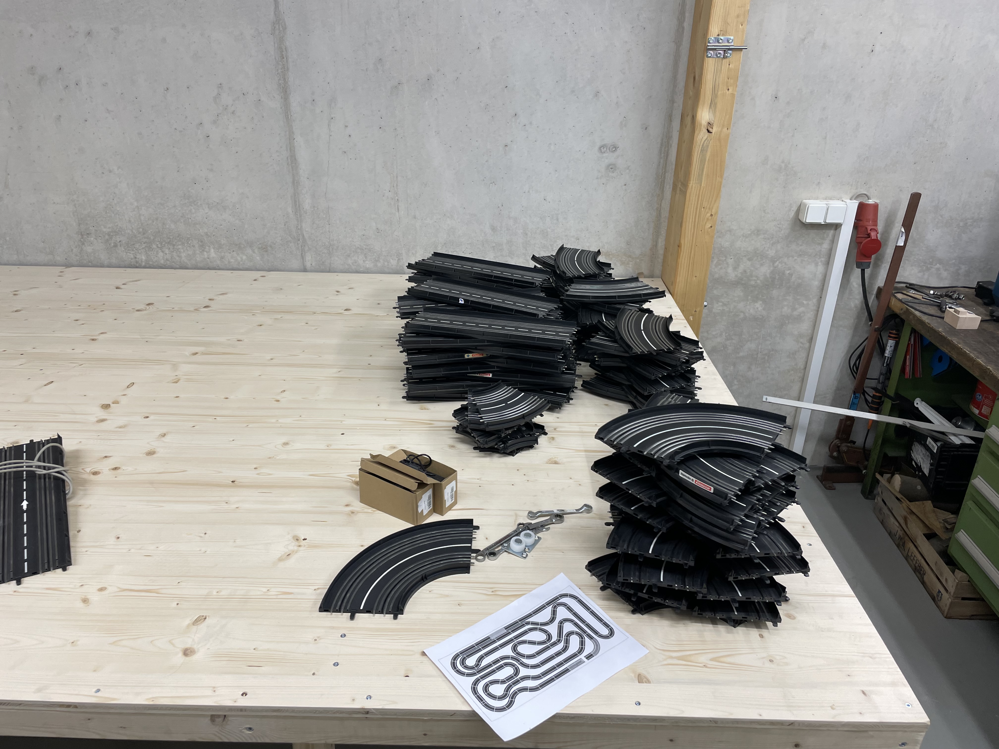 Jetzt das, was jeder kennt..Schienenmaterial begutachten, aussortieren und herrichten - Muskelkater war garantiert, aber der hat sich gelohnt. Bahn aufgebaut und Test gefahren..schöne Strecke! Die Omegas mit den K2 Kurven fahren sich super, auch auf der Innenbahn. Die Spurwechsel funktionieren auch an den kurzen Geraden.
