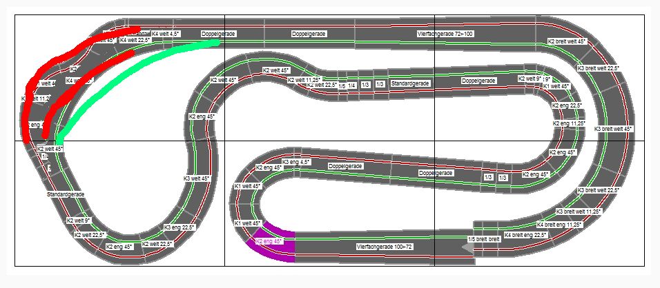 Spurwechsel sollte an der unteren kurzen Gerade trotzdem noch machbar sein (zumindest von innen nach außen).