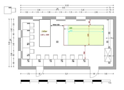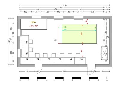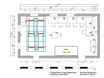 wie wäre es denn die Basteltische wie gaaaaaaaaaanz früher an die obere Fensterfront und um die Ecke bis zum Schrank zu stellen. Die Platte der 140er um 90° drehen und in den Raum links vom Pfeiler und die 160er parallel rechts vom Pfeiler an der unteren Wand?