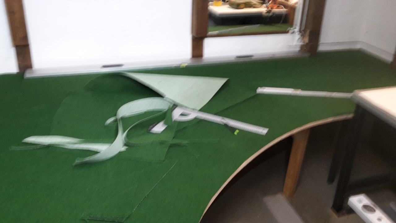 Den Teppich habe ich nur an den Stößen mit doppelseitigem Klebeband auf der Platte fixiert, sonst liegt er einfach nur druff.