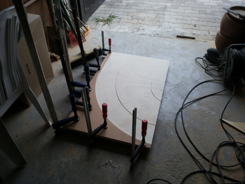 Für die restlichen zwei Module sind die Innenführungen schon angezeichnet, muss ich morgen nur kurz drüberfräsen, das geht ganz fix. Dann sind die Geraden dran. Liege also (noch) gut in der Zeit. Bis Samstag sollen alle Platten geleimt sein... MO GUGGE.