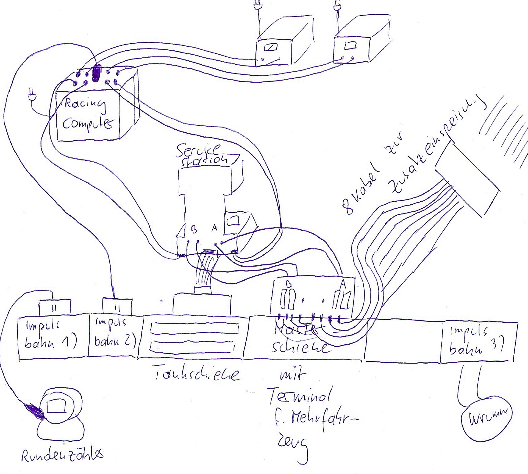 wenn ich dich richtig verstehe, hast Du das ganze Originalzubehör (Tanke, Racinggcomp, Starter) in Betrieb, aber elektrisch so abgekoppelt, dass auch mit gebrückten Trafos nichts kaputt gehen kann?