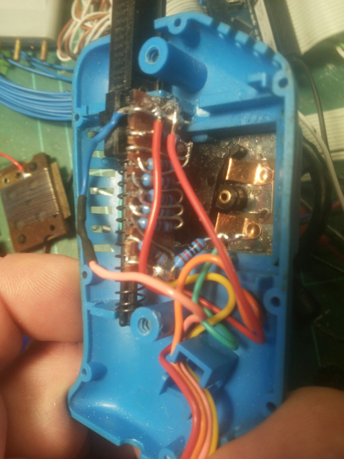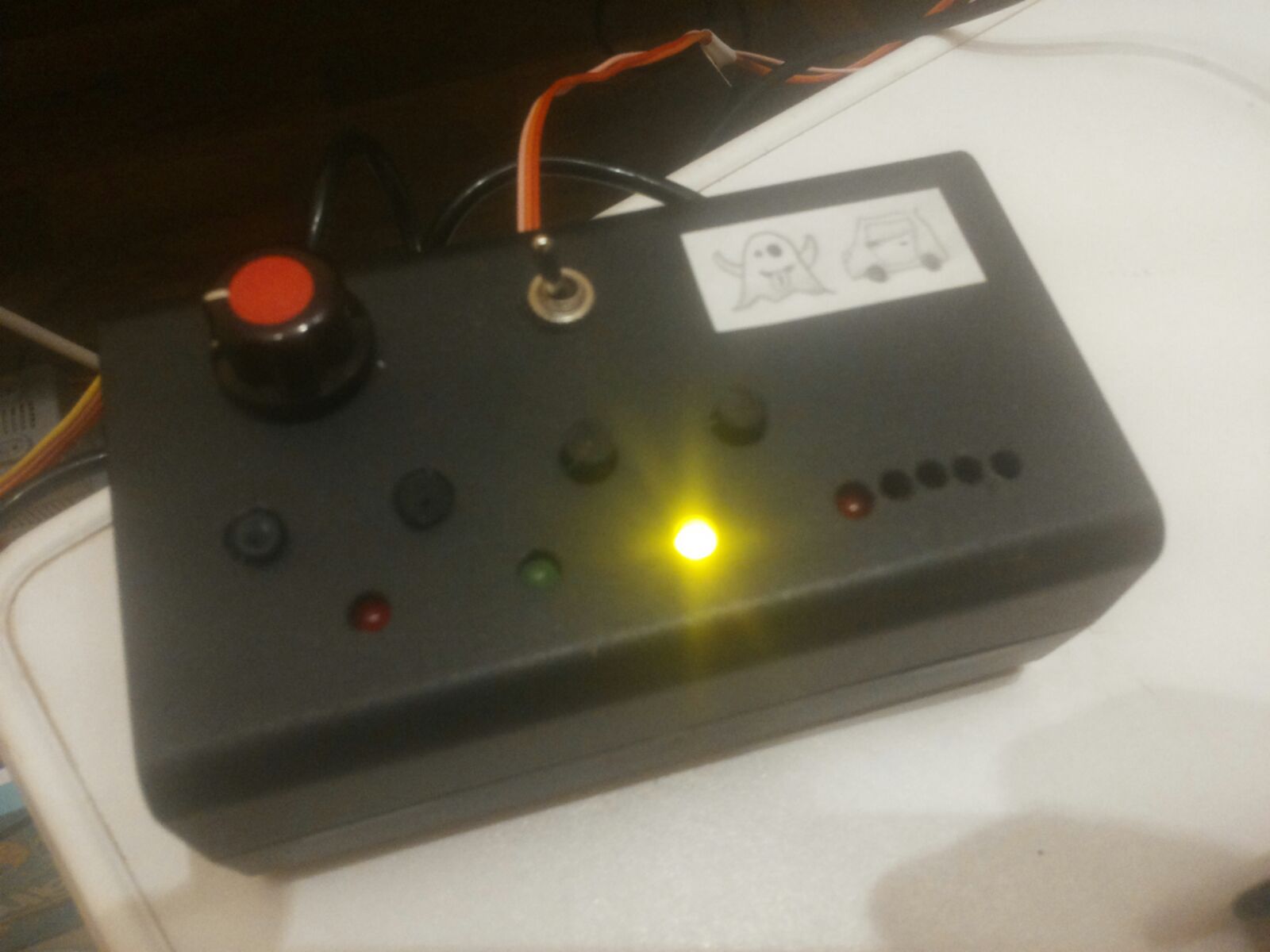 Zur Steuerung ist ein speziell umgebauter Regler erforderlich, der statt eines Regelwiderstands ein Stück Streifenrasterplatine mit einer widerstandskette drin hat. Hintergrund ist, dass der Arduino einen Regelwiderstand von 10-50 Kilo(!)ohm braucht. Wenn man einen 60-Ohm-Regler anschließt, kommen keine zuverlässigen Ergebnisse raus. Die Ghost Car Box hat folgende Bedienelemente (sorry, schon wieder so ein schlechtes Bild, hab leider kein anderes da): - oben: Poti zur Justierung der Regelkurve (funktioniert ähnlich wie am Parma), Umschaltung A/B