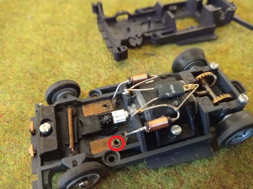 zu Coronazeiten bin ich mal billig an eine 75500er Rennsportpackung nebst etwas Zubehör gekommen, hatte aber nie die Zeit dafür - hat bis letzte Woche gedauert. Ergebnis: der blaue 935er läuft sehr gut, ebenso das BMW Hindernisauto. Beim Capri war aber eines der Führungshörner abgebrochen. Ich hatte dann mal ein 140er Ersatzchassis besorgt, da brauch ich aber einen Tipp hier für: wie kriege ich die Kontaktplatte raus und vor allem wieder eingebaut, an der die Motordrähte angelötet sind. Hier mal ein Bild: Ich habe das mal angekringelt. Das sind ja Ösen, die sollte man rauskriegen, aber gehen die dann auch wieder rein - oder, wenn nein, irgendein Tipp, was man stattdessen verwenden könnte, bevor ich selber anfange zu suchen?