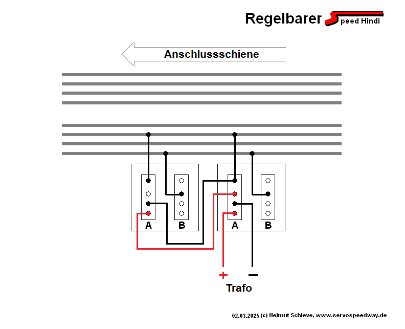 Wofür ist denn die Verbindung ganz rechts vom untersten Leiter nach B? Und die Verbindung vom Regleranschluss A ganz oben zur Schiene sollte doch eigentlich auch nicht nötig sein??