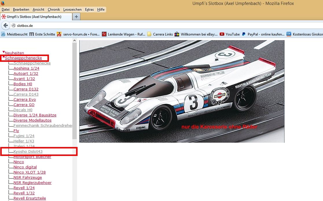 Geil...den 917 haben möchte ...also, wenn'a iwahaupt passt...in da breiteseal hat geschrieben:Weiß ja nicht, ob das für die 140er-Fraktion interessant ist. Bei Umpfi gibt es schöne Kyosho-Dslot43-Karossen im Ausverkauf für €14,95. Sehr schöne Modelle. Weiß aber nicht, ob die für euch passen.