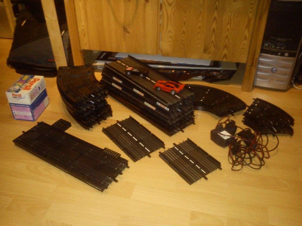 Die Grundpackung war der kleinste Teil... Neben Schienen (leider nur schmale Leiter) und großem Trafo war das alles dabei...: War zwar auch nicht ganz billig, aber definitiv ein Schnäppchen. Die Trucks - wie neu! Und den weißen Porsche hab' ich sogar erst hier zu Hause entdeckt. Der war in das Staubtuch eingewickelt. Ist zwar kopflos, aber sonst ohne Macken...