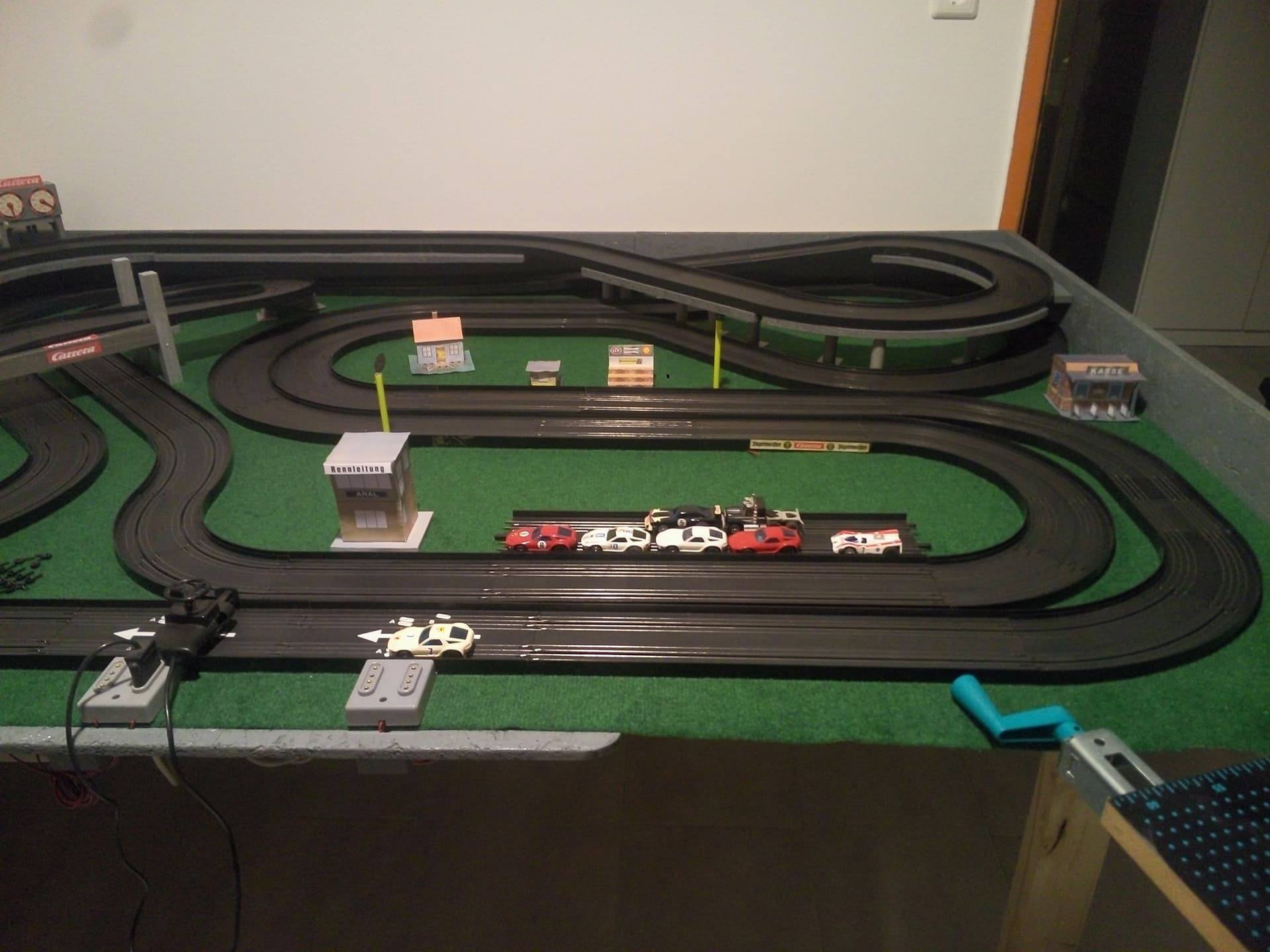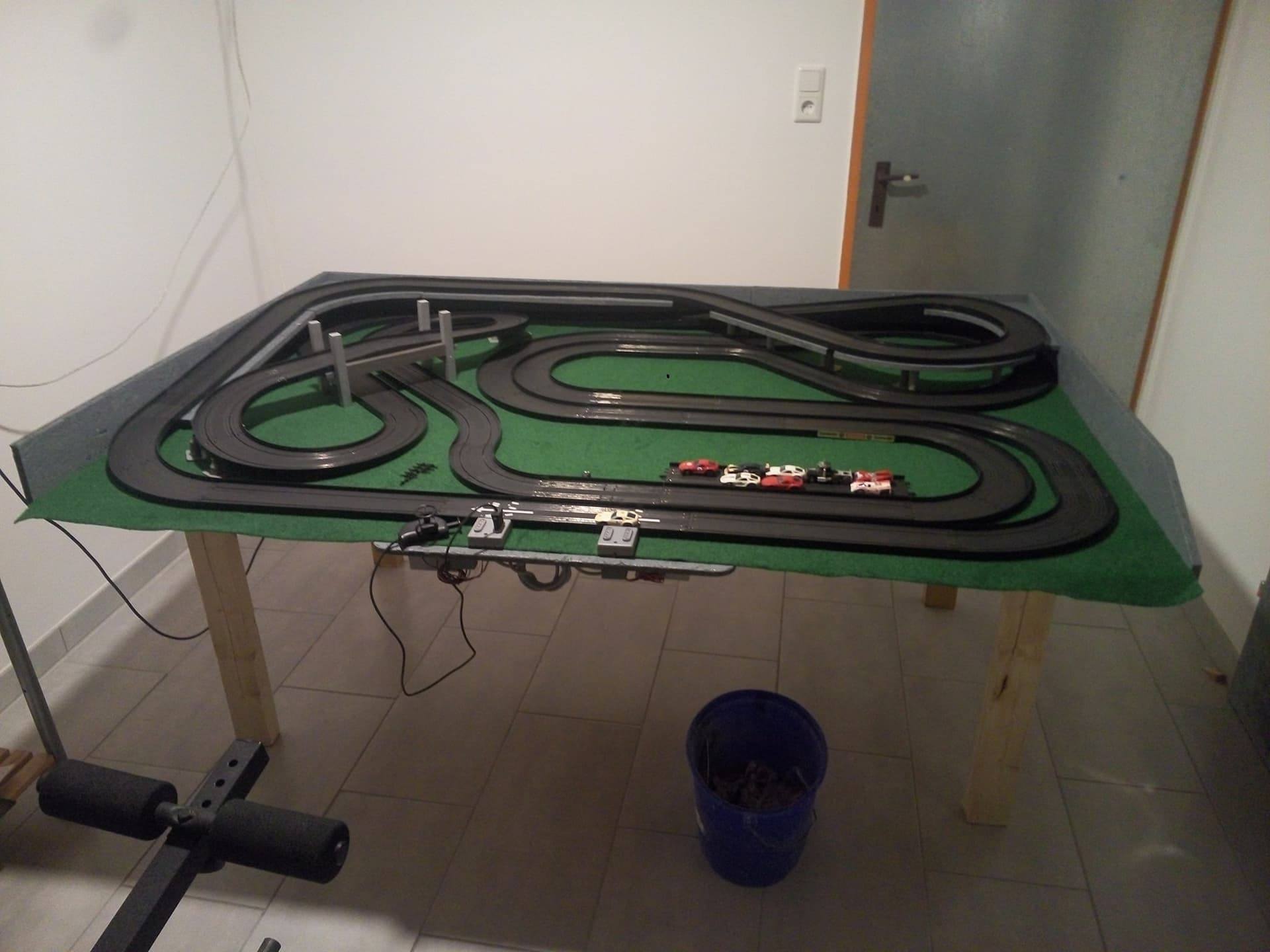 Noch ein kleiner Hinweis zur Bande / Begrenzung deiner Platte. Mach die Banden höher (vor allem dort, wo du in der 2. Ebene fährst) und polster sie. Oder mach noch Fangnetze oben drauf. Und vorne rechts würde ich auch noch eine Abflugsicherung hinbauen. Deine Autos werden es dir danken...