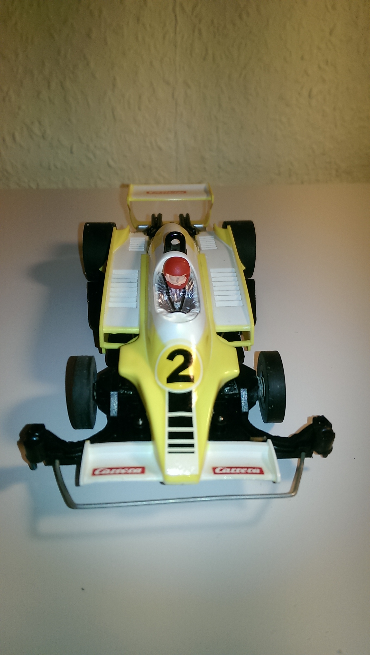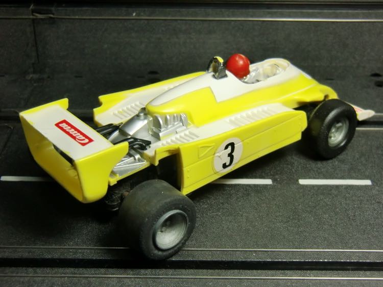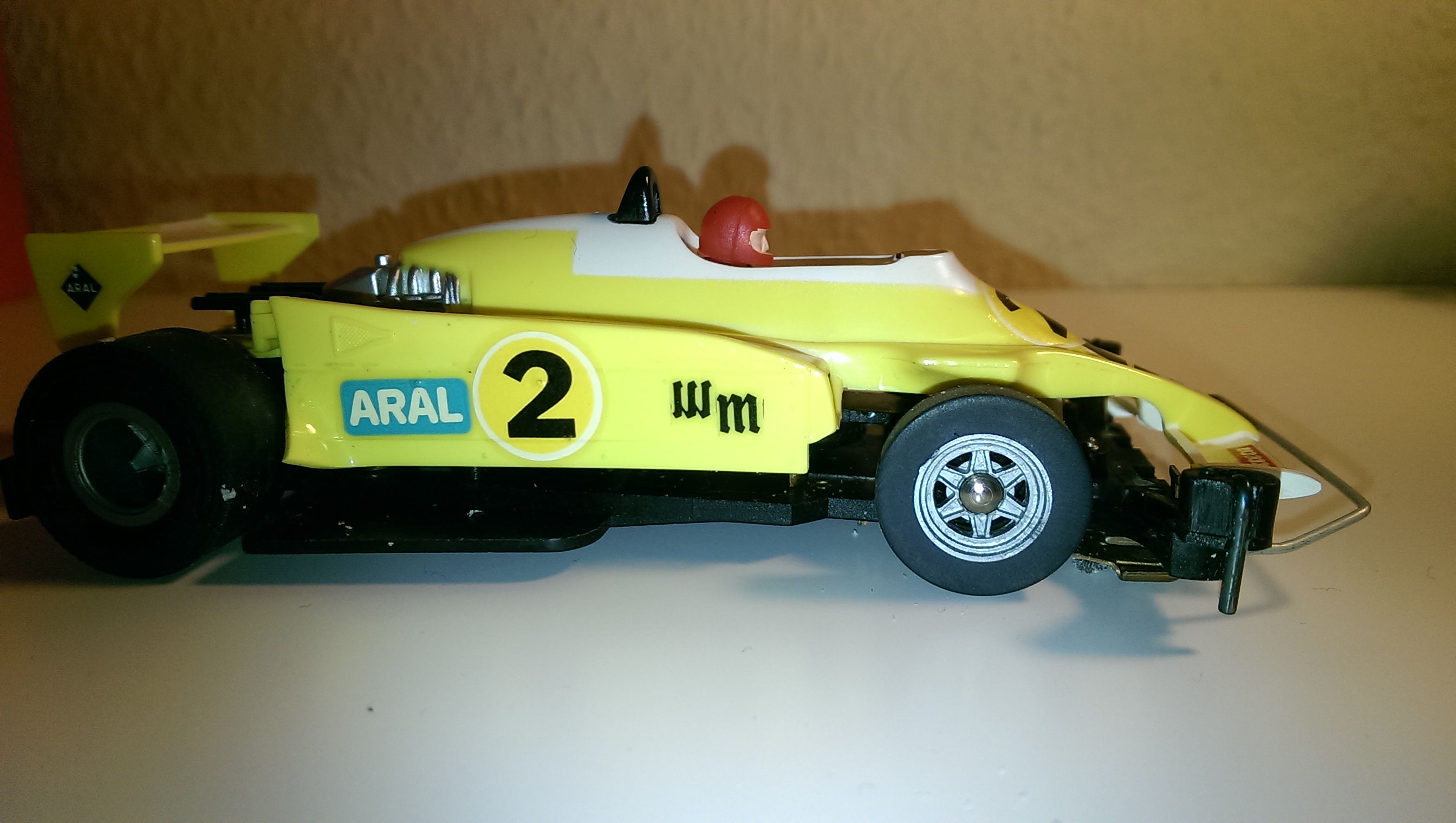 Hier handelt es sich um die Karosse eines Renault RS 10 von Carrera Universal der mit Decals aufgewertet wurde.Felgenvariante 34 an der Hinterachse ( Quelle H.S.B. Carrera Buch ).