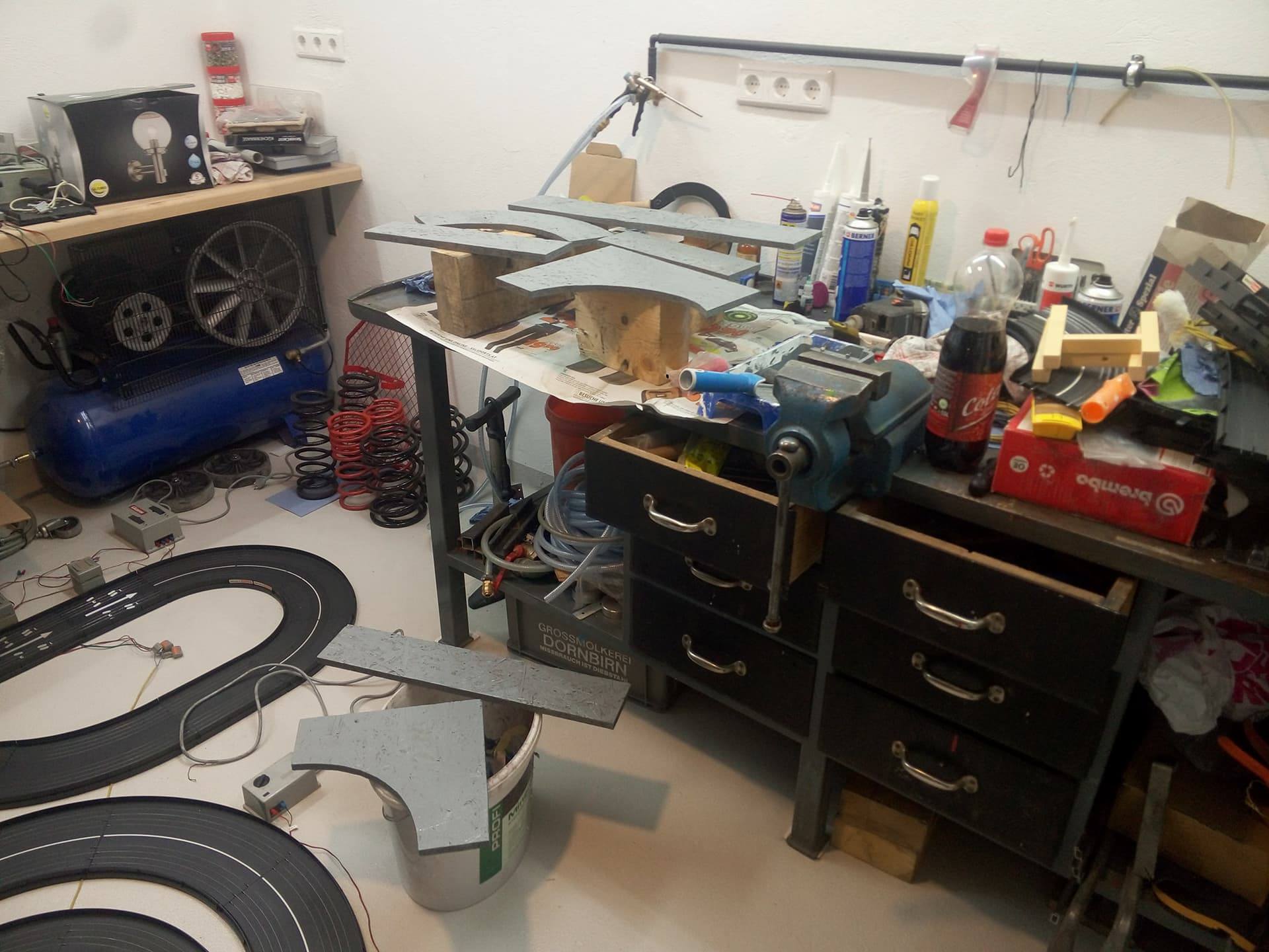 Noch ein kleiner Hinweis zur Bande / Begrenzung deiner Platte. Mach die Banden höher (vor allem dort, wo du in der 2. Ebene fährst) und polster sie. Oder mach noch Fangnetze oben drauf. Und vorne rechts würde ich auch noch eine Abflugsicherung hinbauen. Deine Autos werden es dir danken...