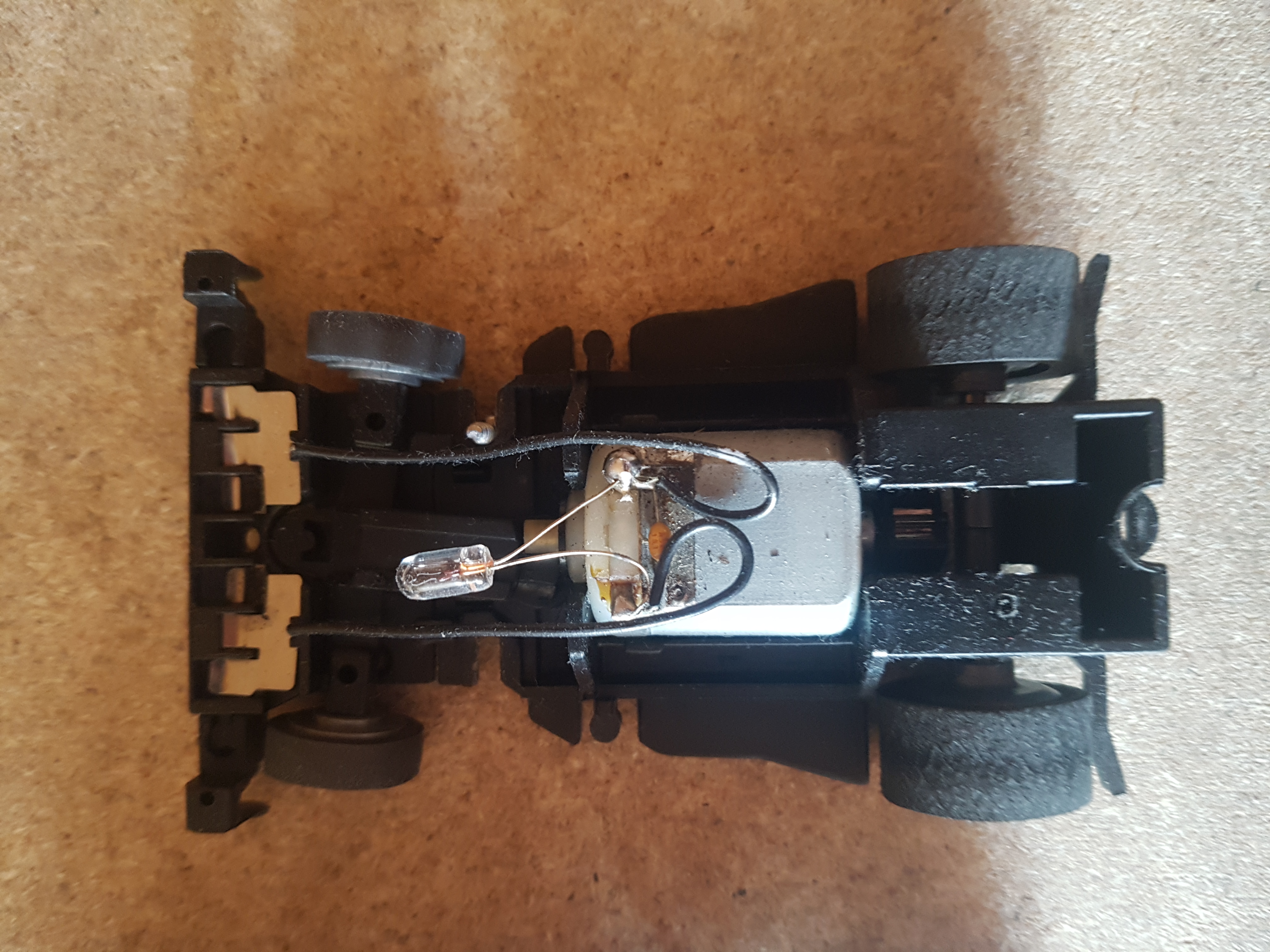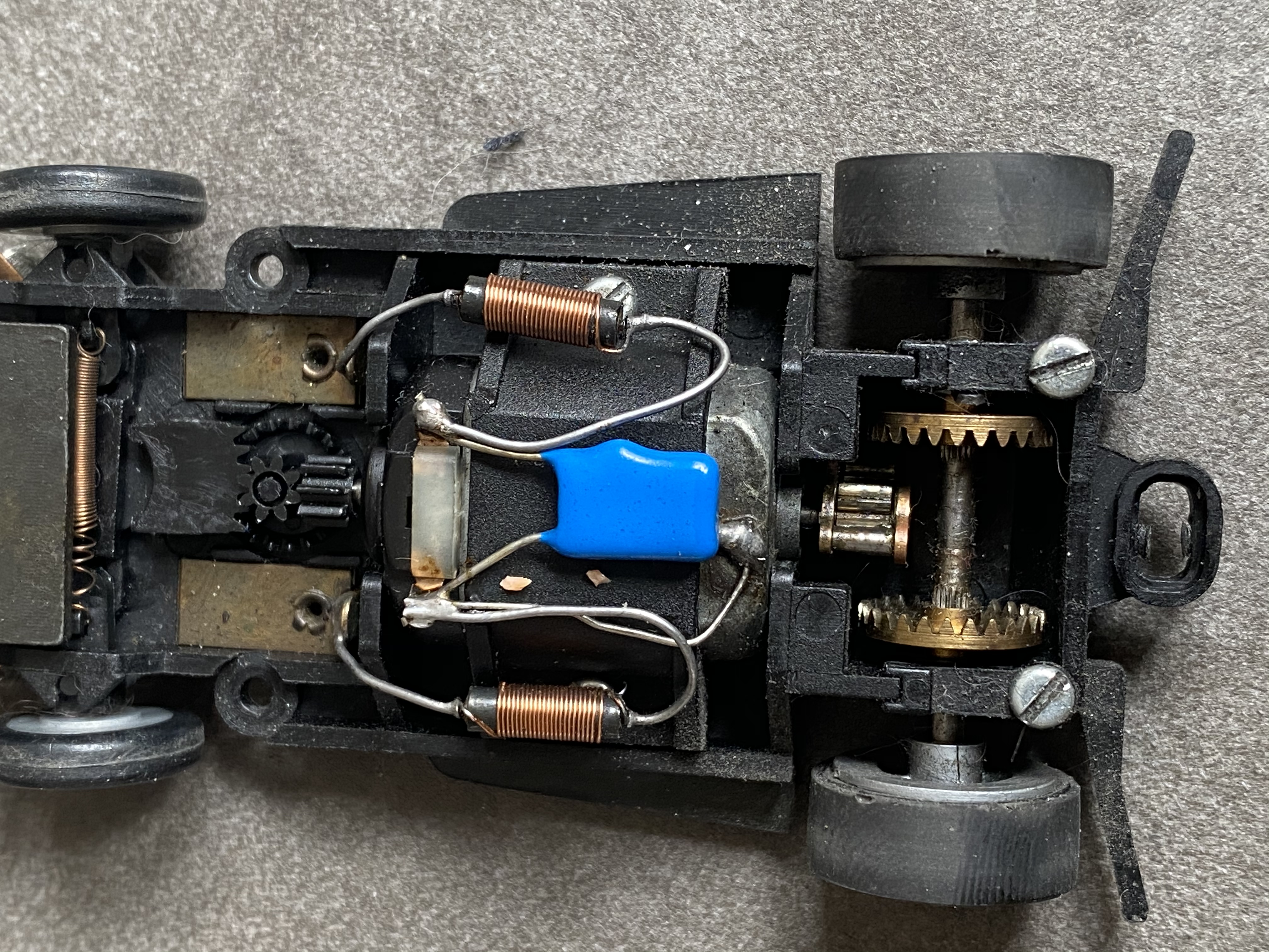 Spurstift raus...und wenn der Federduck der Schleifer stimmt, rennt das Ding....vermutlich besser ohne die zu breite Capri-Karosse