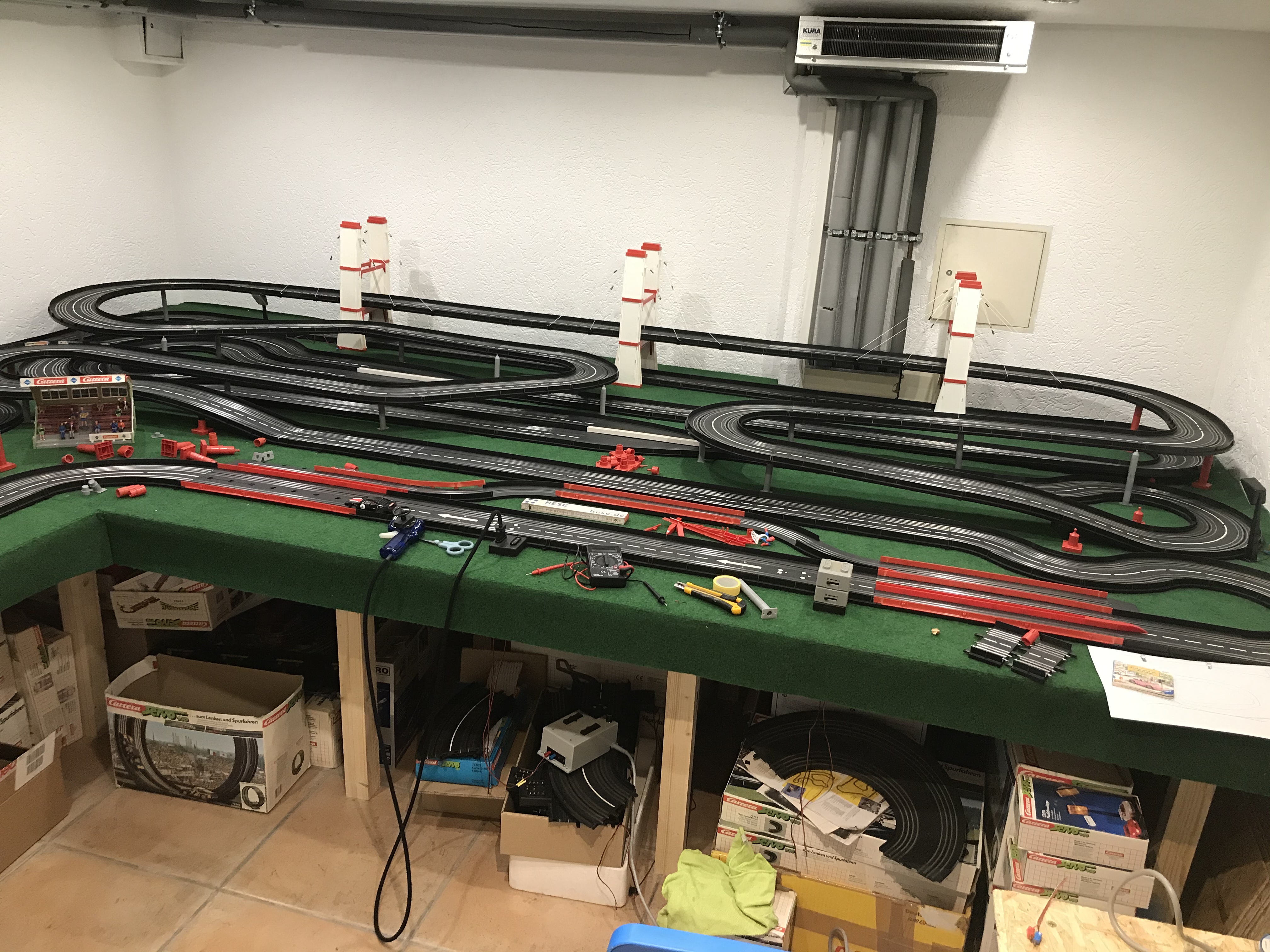 neben dem Material auf dem Tisch ist noch ausreichend Schienenmaterial vorhanden. Auf jeden Fall sollen es zwei Ebenen werden. Ich mache gleich noch ein Foto von oben. Vielleicht kannst du auf dem Schikanenbereich aufbauen. Dieser gefällt mir eigentlich ganz gut. Bin aber auch für Alternativen offen....