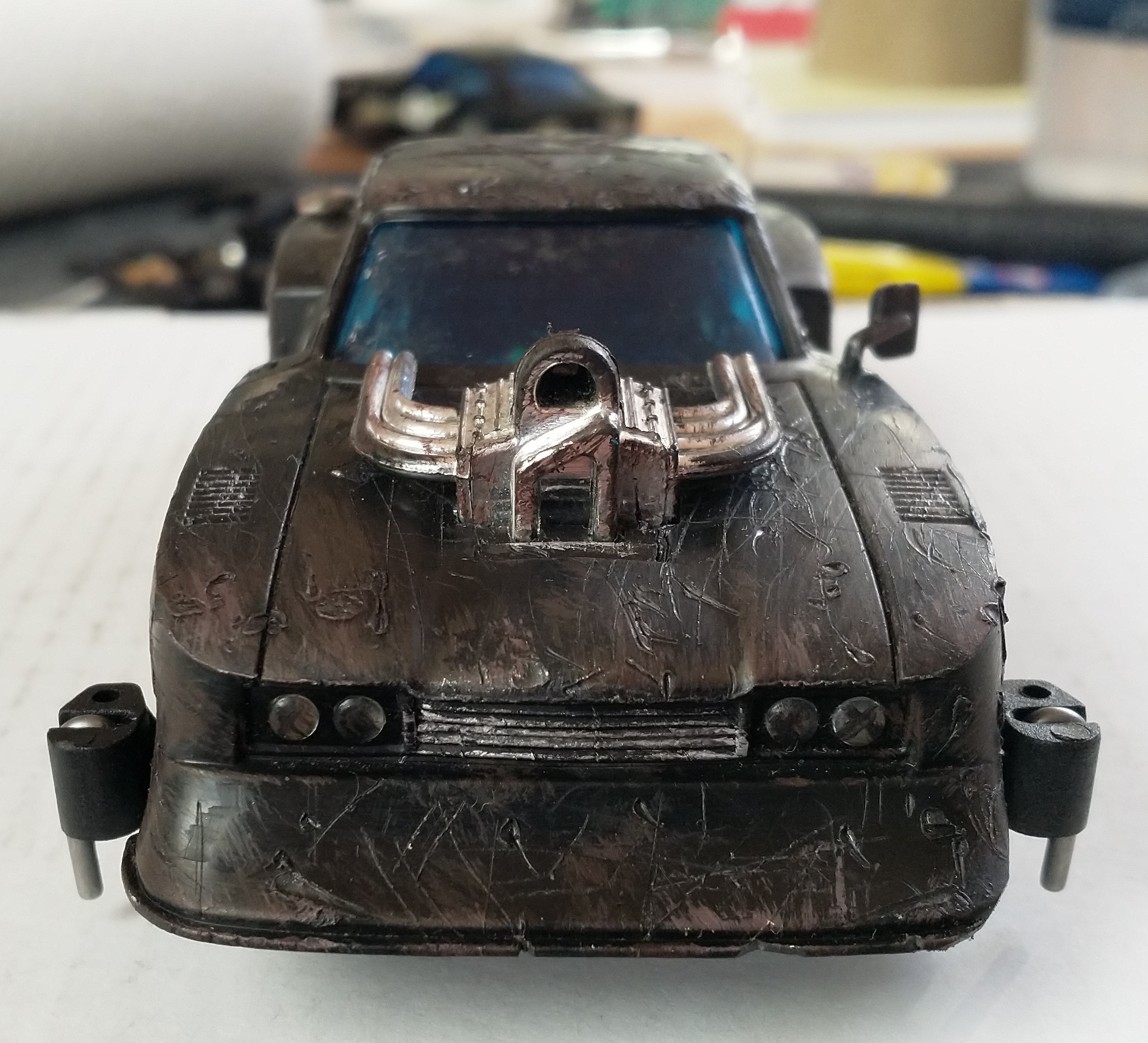 Habe jetzt den Frontspoiler (auf dem Foto ist eine Seite vorher und eine nachher) seitlich bearbeitet damit er nicht mehr vor dem Führungshorn auf die Innenführung trifft und die Karosse auf ein letzte Generation V1 Chassis gebaut. Dadurch ist die Karosse höher als die Innenführung. Habe aber das Gefühl diese Chassis sind irgendwie unbrauchbar durch die geänderten mittigen Abstandsflügel, und die größeren Felgen mit breiter Spur. Die älteren Chassis schaffen eine bessere Tangente. Anhand der Felgen sieht man es gut.