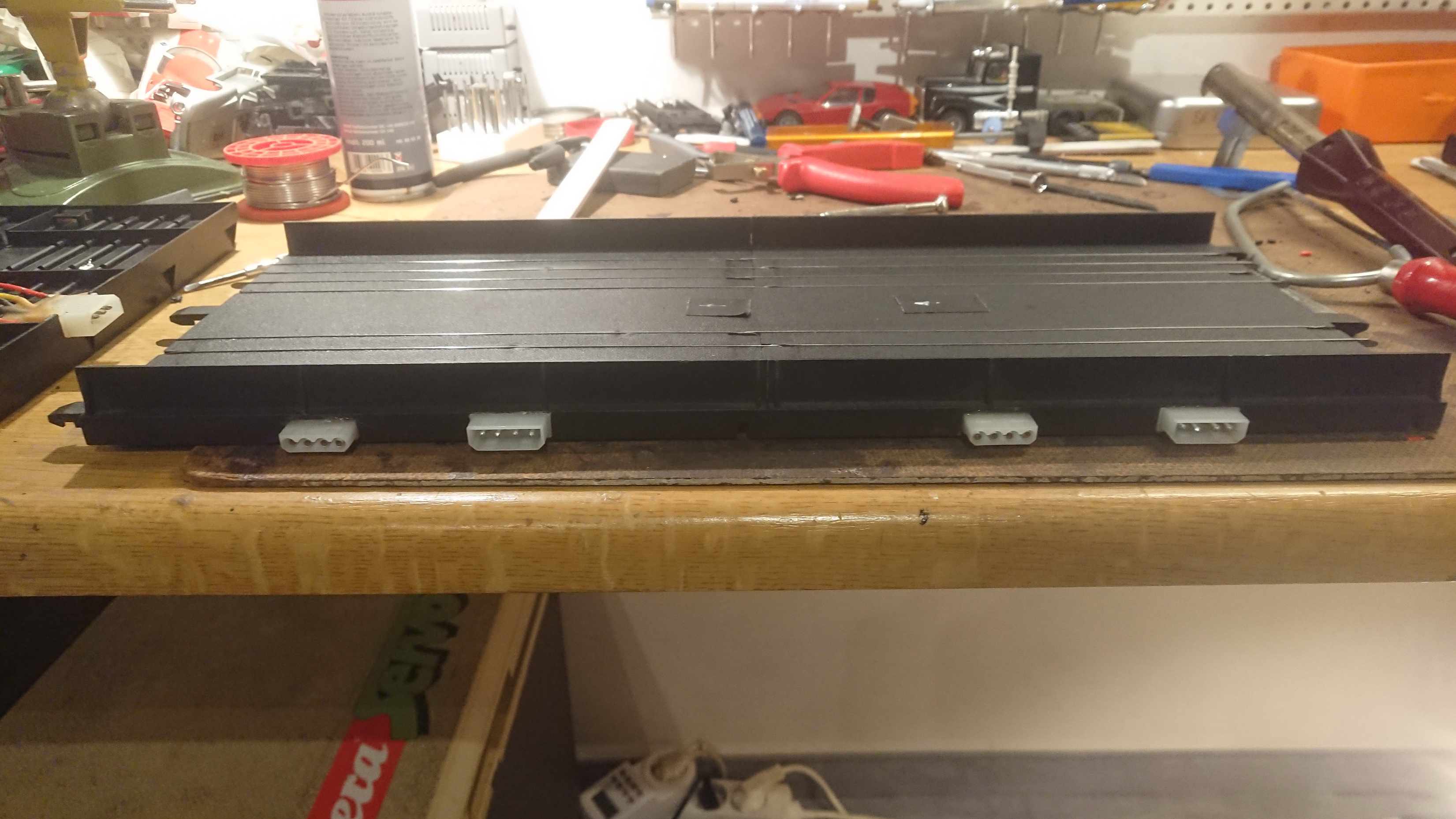 Erst waren noch ein paar Kurzschlüsse auf der Bahn. Hab in der Woche davor mit drei Bier im Schädel Stromeinspeisungen gelötet. Sollte man nicht machen, das ist ohne schon kompliziert genug...