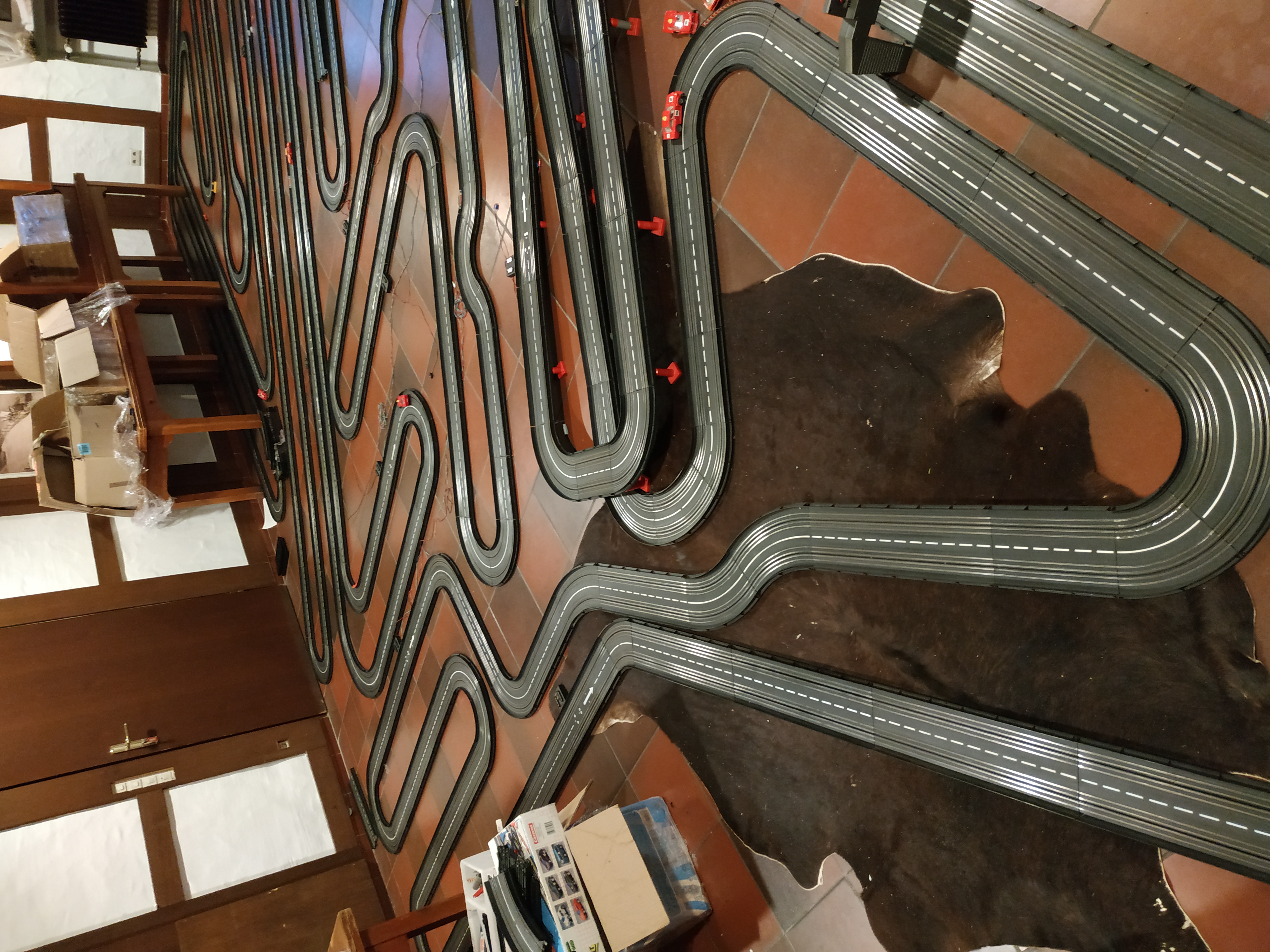 Da war ein Zimmer über. Und so hat mich der Wahn dann gepackt. Die erste eigene Bahn war dann die Avus Grundpackung. Und natürlich kämmen dann noch ein paar Schienen und Autos dazu. Und natürlich Unmengen an Bürstenschleifern. Leider gab es zu der Zeit noch nicht wirklich eBay.