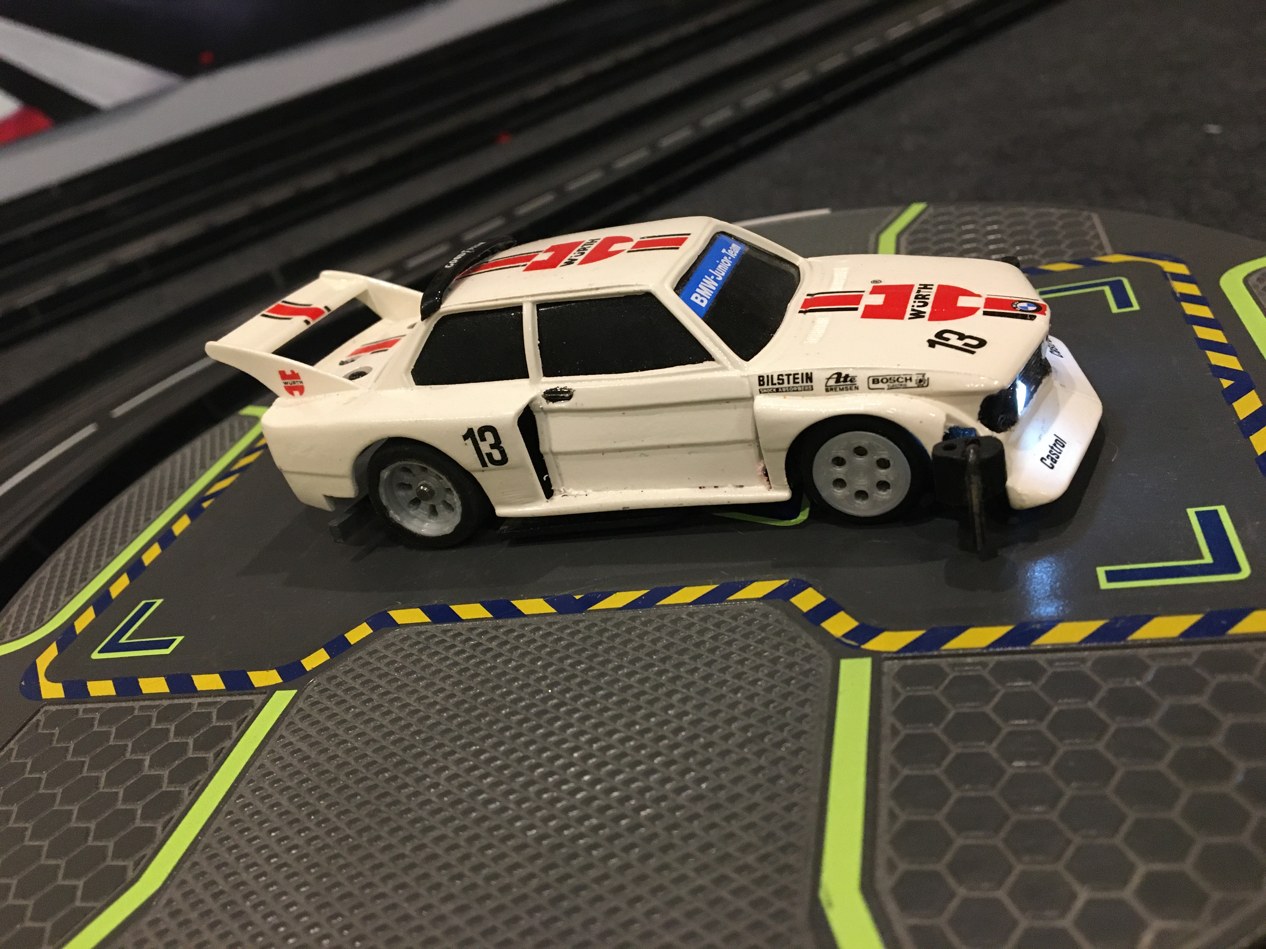 Anschließend wird die Lauffläche geschliffen, dann der Reifen. Wenn man nicht direkt Bockmist baut, gibt das absolut ausreichenden Rundlauf. Vielleicht nicht um wettbewerbfahrende Slotter zu befriedigen, aber doch locker um Faktor 10 besser als Originalfelgen mit ungeschliffenen Reifen.