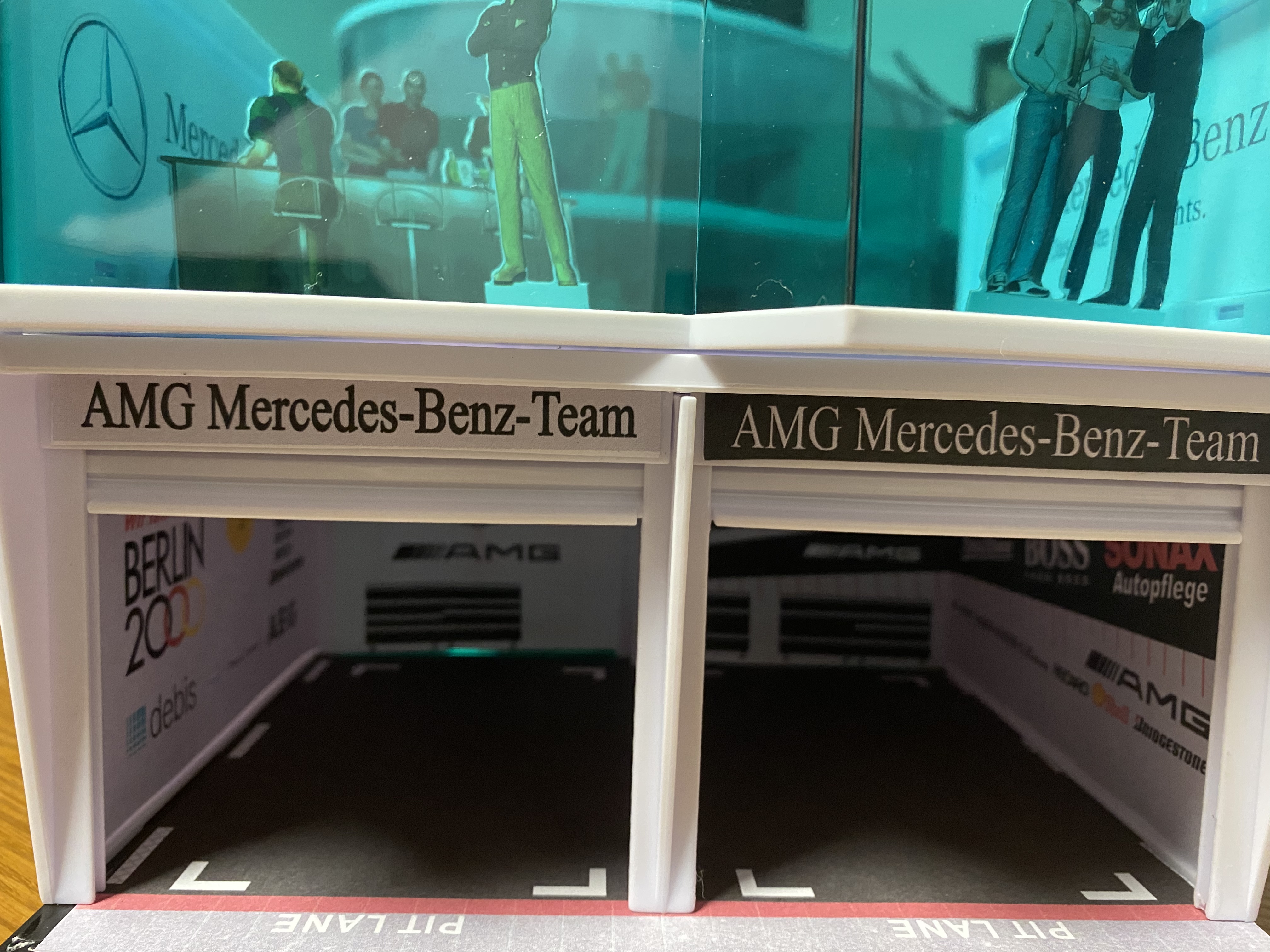 Moin gemeinde. Neue Sachen sind eingetroffen , meine Boxengasse wäre dann schon mal Ready, Turm wird aber noch ausgeschmückt innerlich und bastel noch an Antennen für die TV Anstalten , ebenfalls neu dazu gesellt sich nun Hans Werner Aufrecht (R.I.P.) mit dem HWA Mercedes und dem AMG Mercedes Team von Norbert Haug
