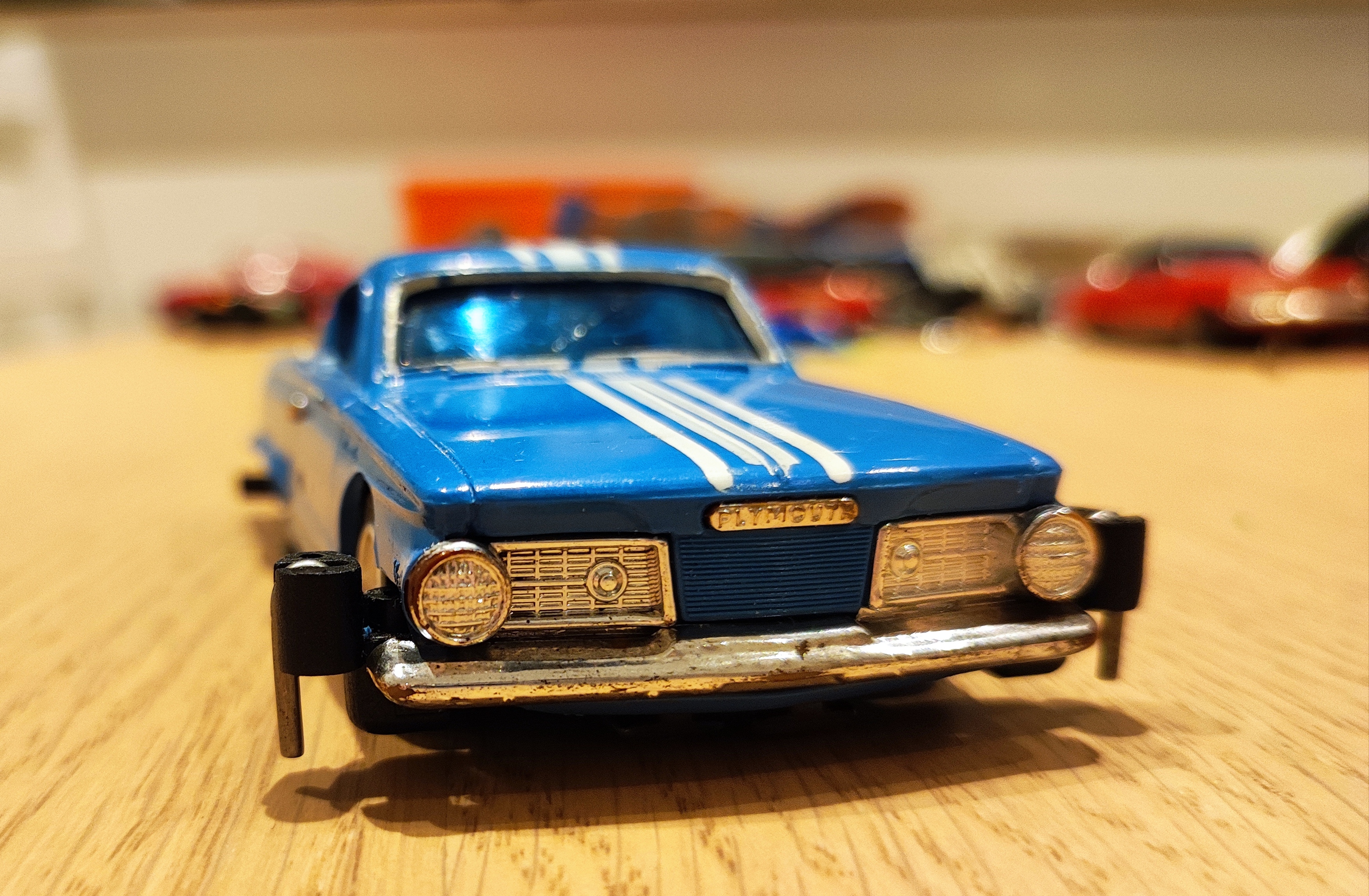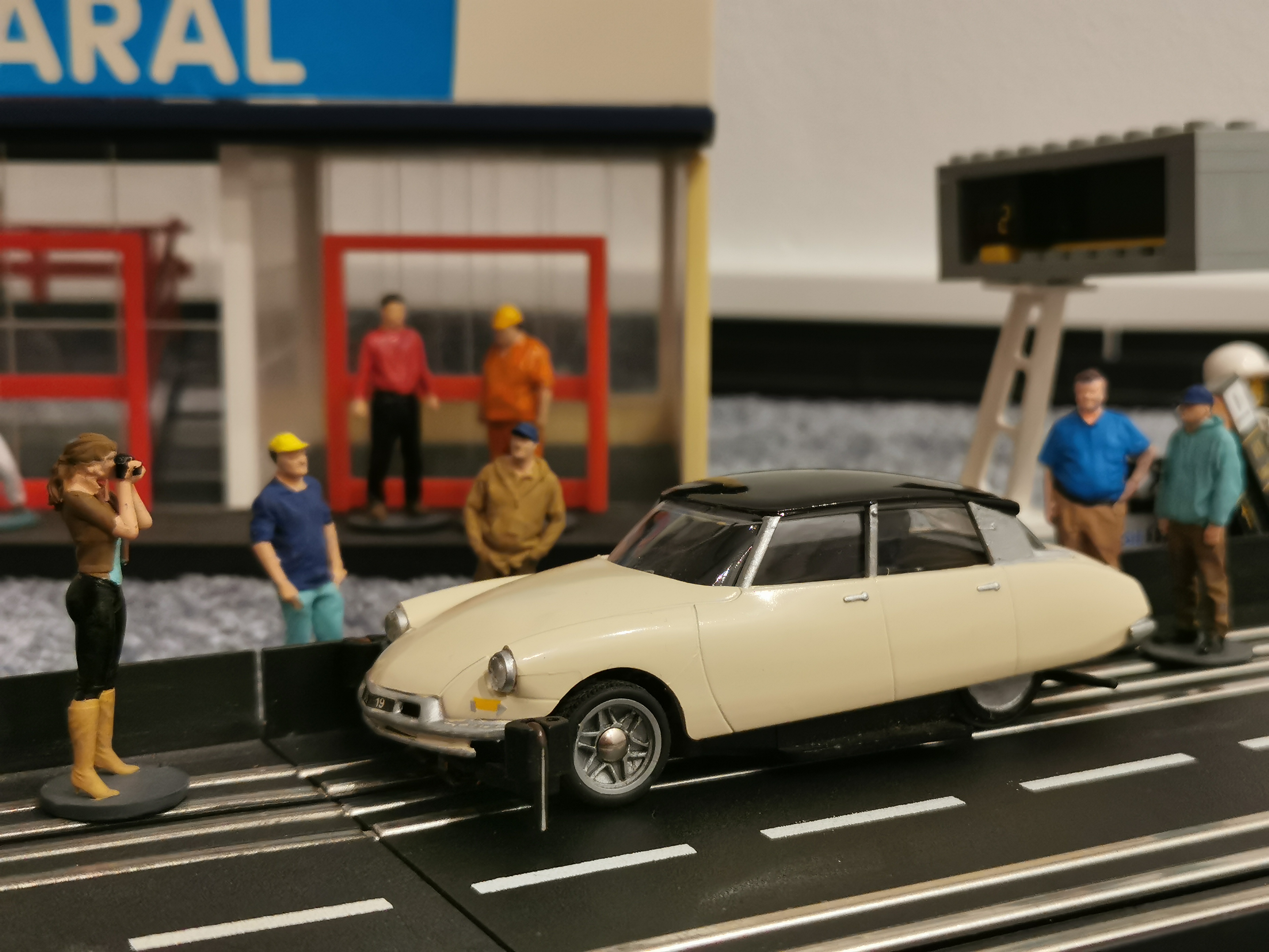 Größe passt im Vergleich sonst gut. Steht auf einem Mabuchi Klemmchassis. Leider vintage, die Karos sind nur mühsam in den USA zu kriegen... bräuchte eigentlich auch ne andere Scheibe, die hier ist gerissen