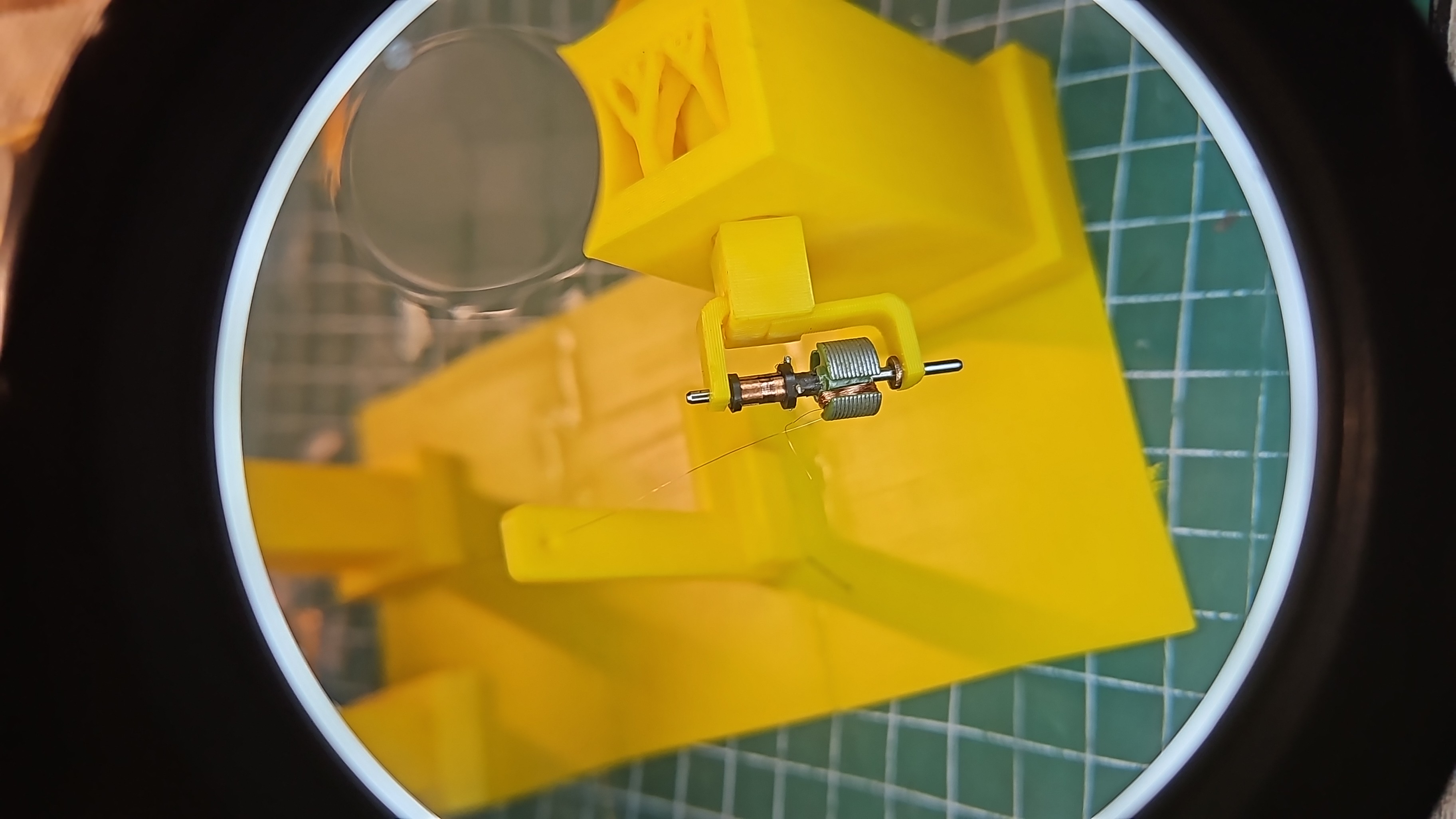 Mit den 0,08 mm kupferlackdraht ist schon eine Herausforderung. Aber mit der Vorspannung geht's gut. Zwar muß man den Draht noch etwas führen um es gleichmäßig zu wickeln. An der Wickelmaschine ist eine Kurbel dran.