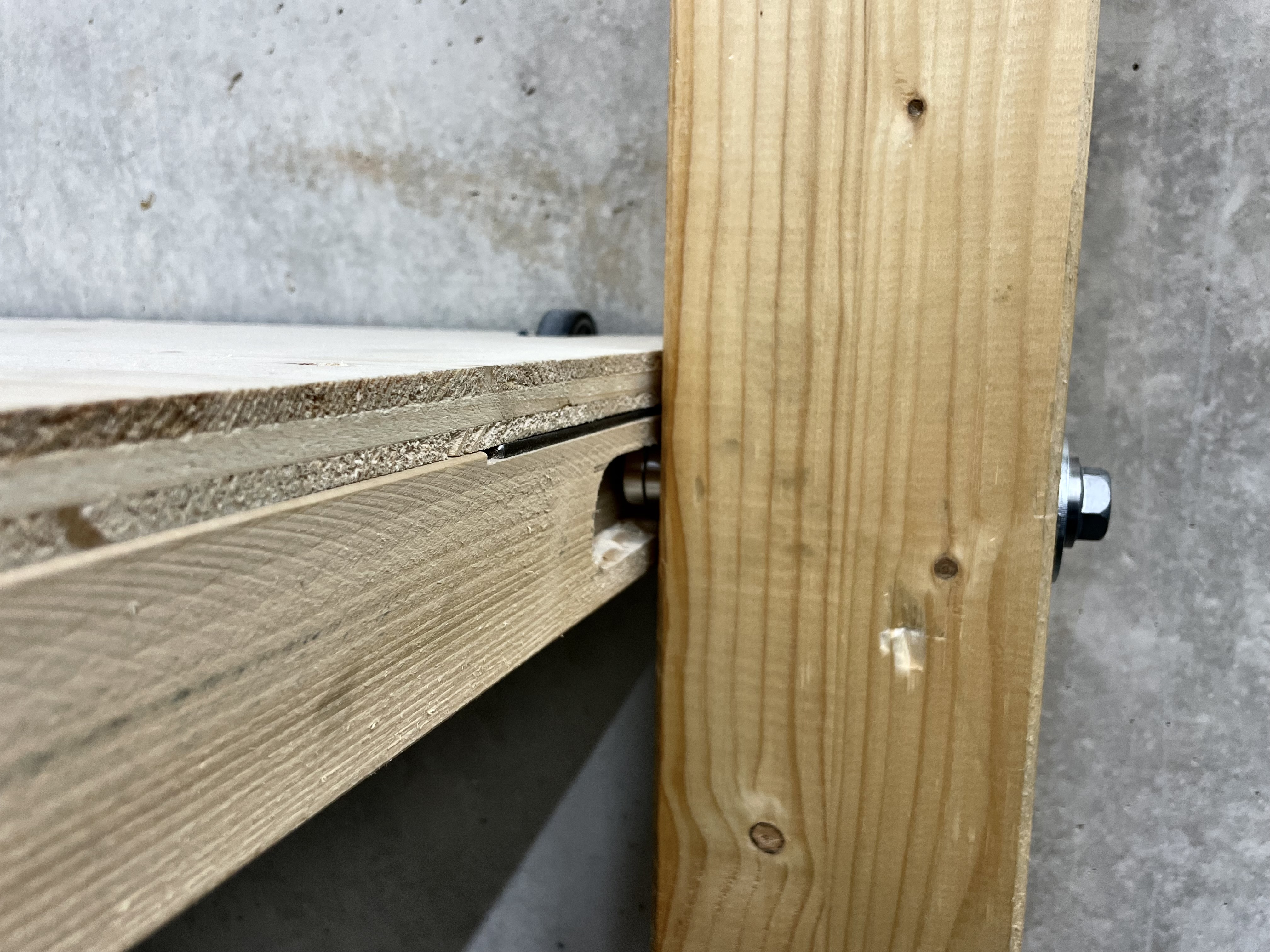- also Längslöcher in den Rahmen, zwischen Platte und Gestellt ausgefräst, mit einer Metallplatte verstärkt und Rollen an der Wandseite eingearbeitet. Beim Hochklappen rutscht die Platte dank Längslöcher nach unten und geht oben an den Lampen vorbei - wohoo!