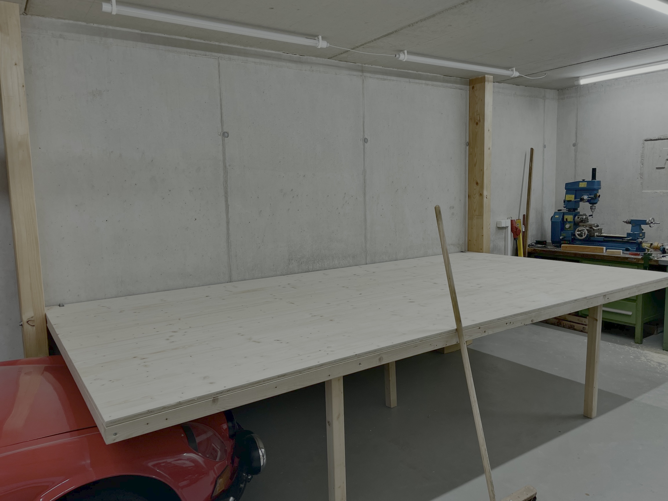 wenn du die platte hochkant an die wand klappst, dann kann man doch auf die fläche die dann zu einem zeigt etwas bauen um die autos dort abzustellen, oder was spricht dagegen?