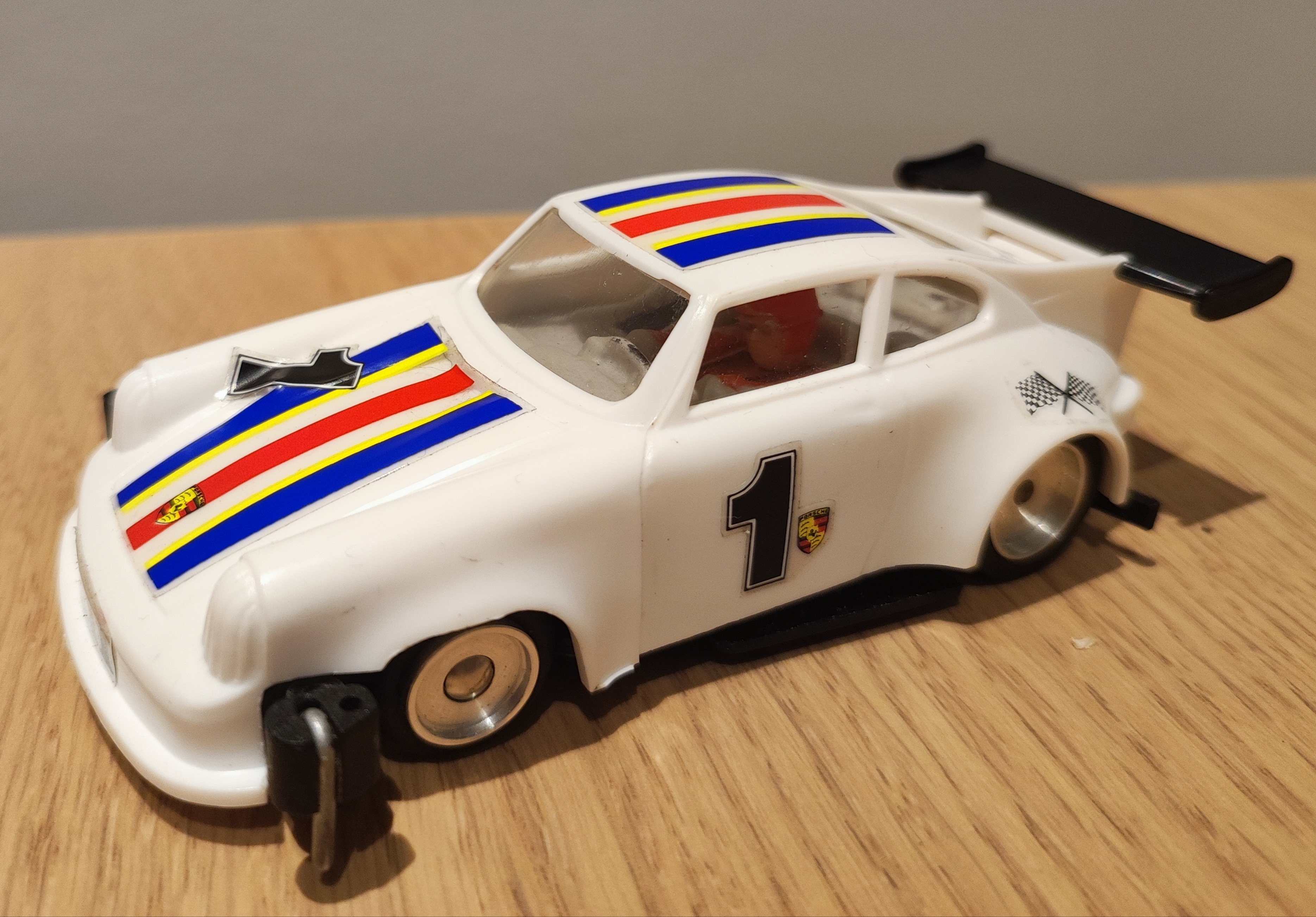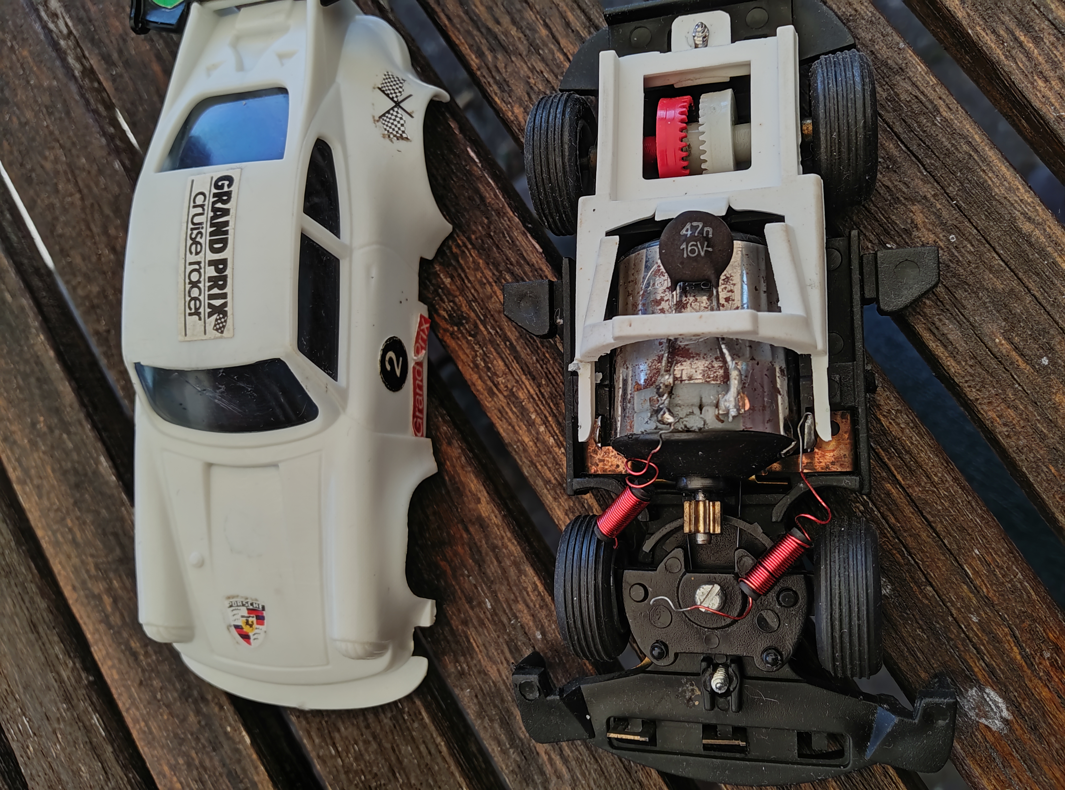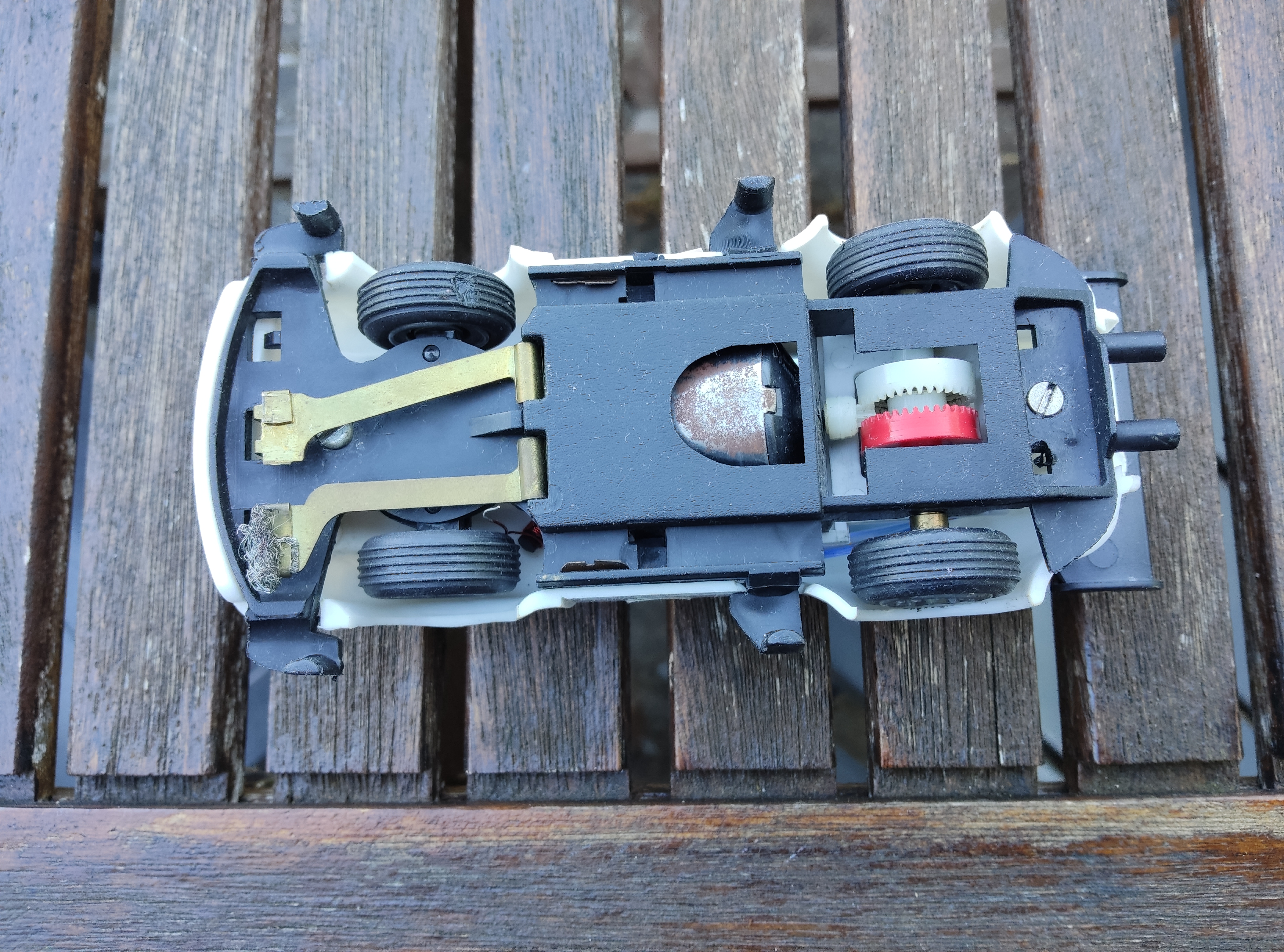 Aber: bekommt man eh nicht auf der Servo zum laufen, ohne ein Carrera-Chassis drunterzuschrauben.