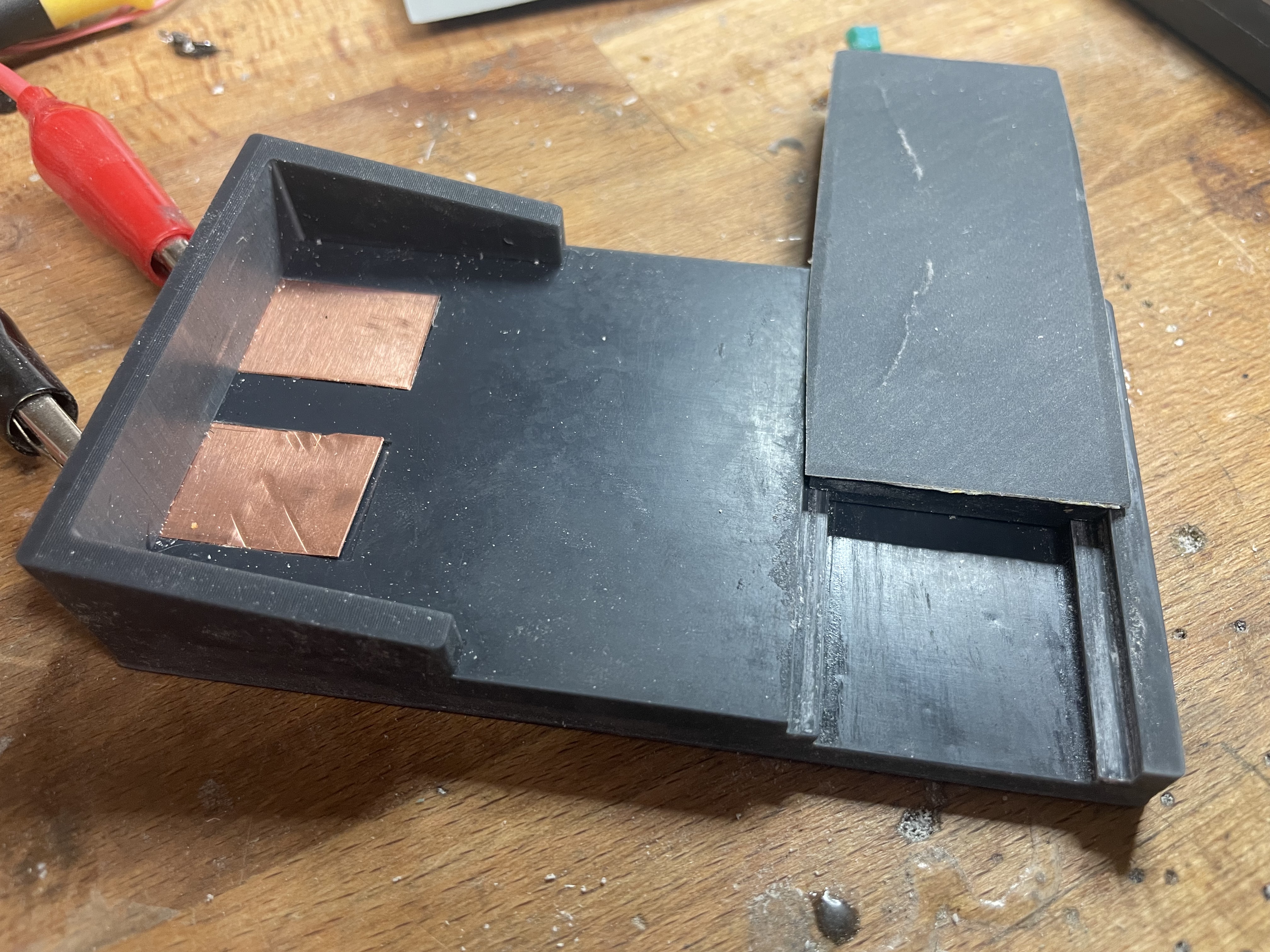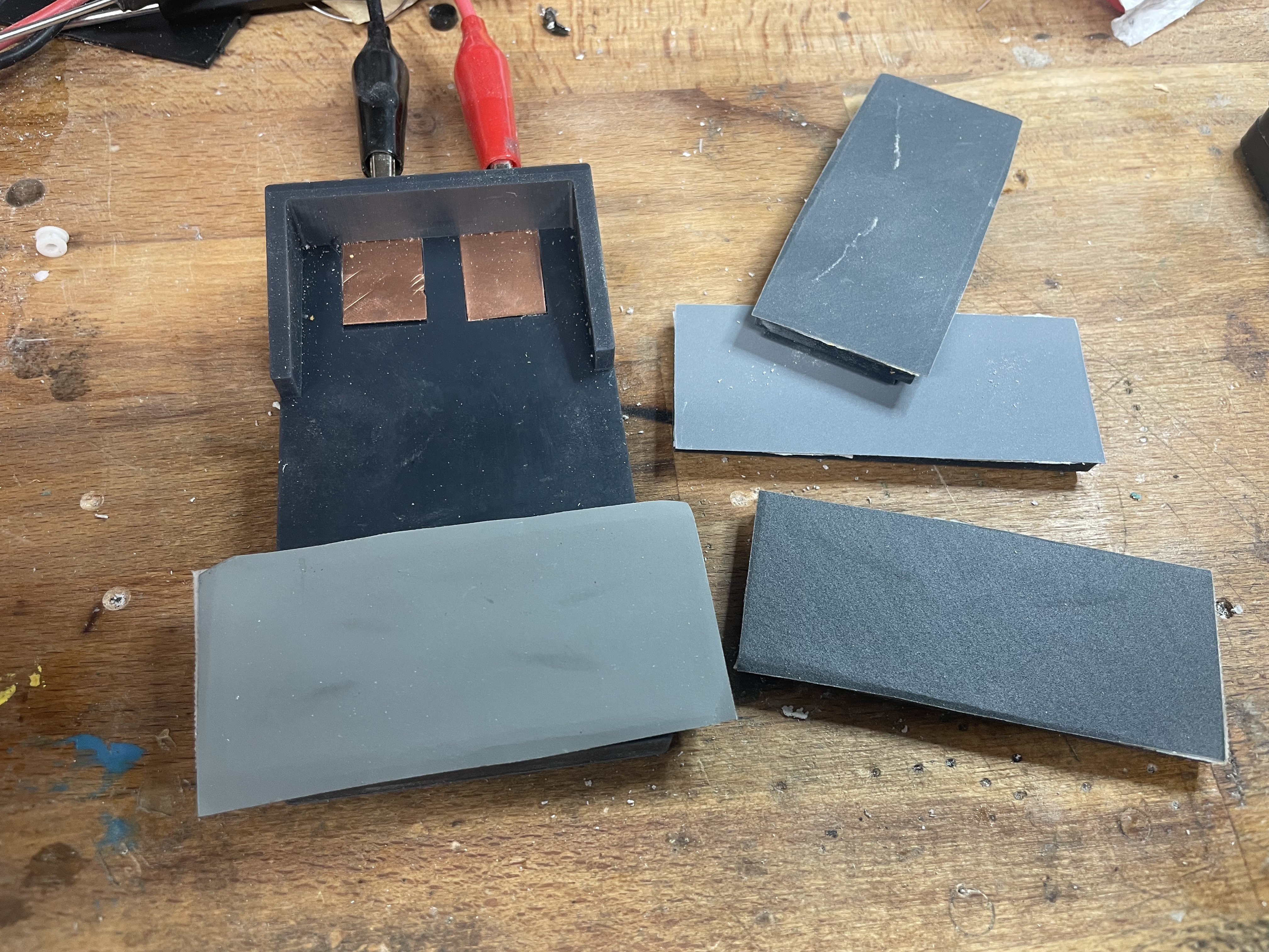 Man braucht zusätzlich nur 2 Kontaktplättchen (z.B. Kupferblech, d=0,7mm zuschneiden) und Doppelklebeband für das Schleifpapier auf den Einschüben.