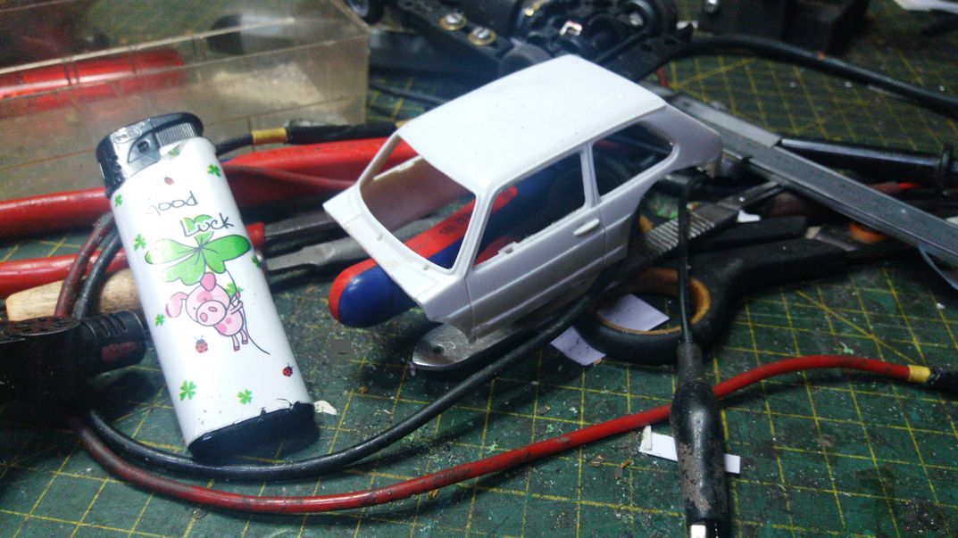 Nur noch Kabel, Schalter, 6xLeds, ICs und Kleber fehlen...noch zu verbauender Kleinkram liegt auf der Batterie..bis jetzt ..wie auf dem Bild gewogen: 136gramm (leicht)