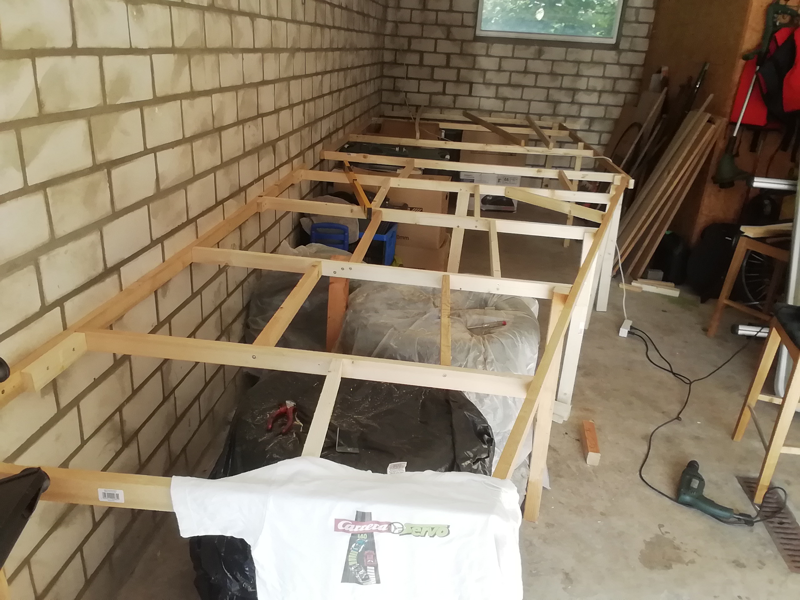 langes Regalbrett dafür, an der Wand befestigt...bevor klettern du mußt...zumindest Winkel oder ne Latte an die Wand knallen, um später Brett auflegen zu können...( in verschiedene Höhen? oder mehrstöckige, zum wechseln, Steckverbindung)..stabil abstützen