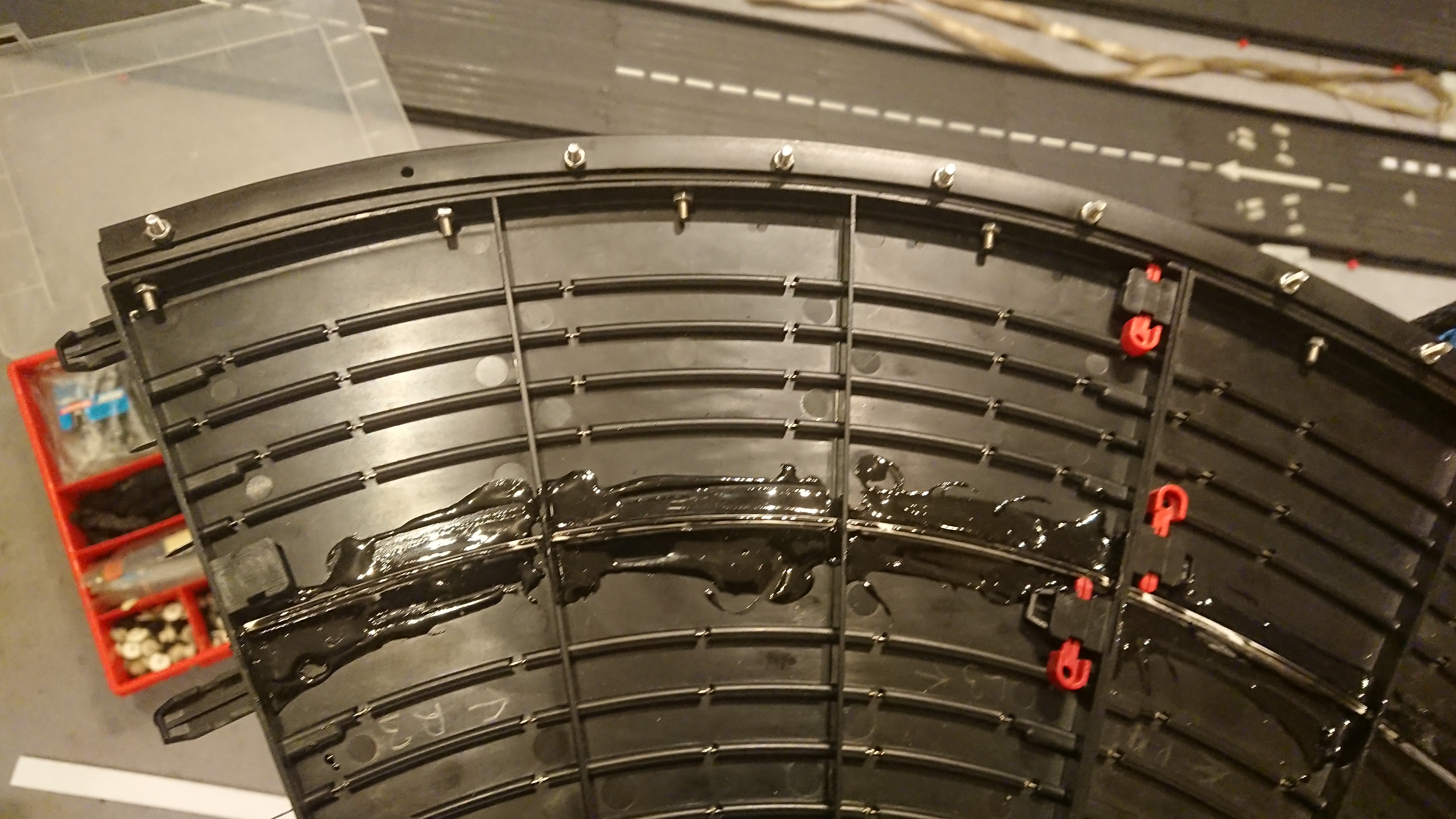 Schlitzen der Schiene für die Plusführung hätten wir uns übrigens sparen können. Das geht besser, wenn man bei einem L einen Schenkel kürzt, das ganze vorbiegt und dann von oben draufklebt. Haben wir bei den anderen Pluskurven so gemacht.