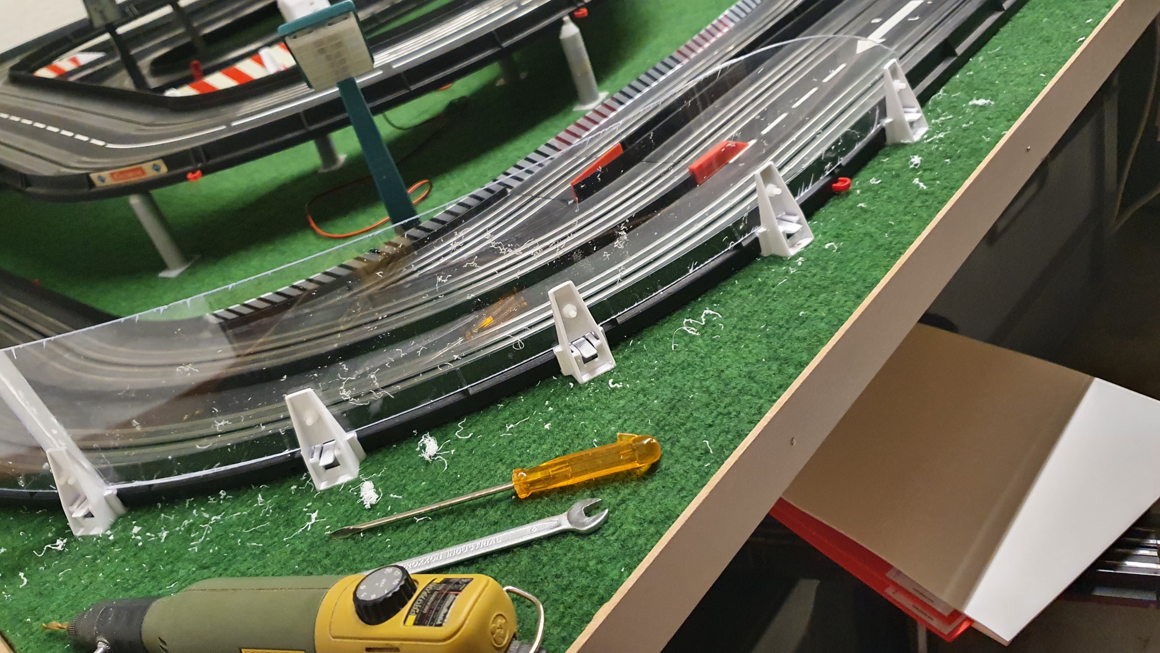 Mit den restlichen Haltern der Carrera Leitplanken via 3 mm vebandelt.