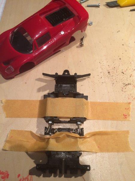 Die Ausbeute der letzten Flohmärkte war sehr dürftig... zumindest hab ich zwei Shell Ferraris für nen 1,-€ bekommen und die Schnitze ich auf die Carrerachassis. Für den F50 muss ich aus einem normalen Chassis ein langes machen... der Oldi hingegen passte zu 90%...