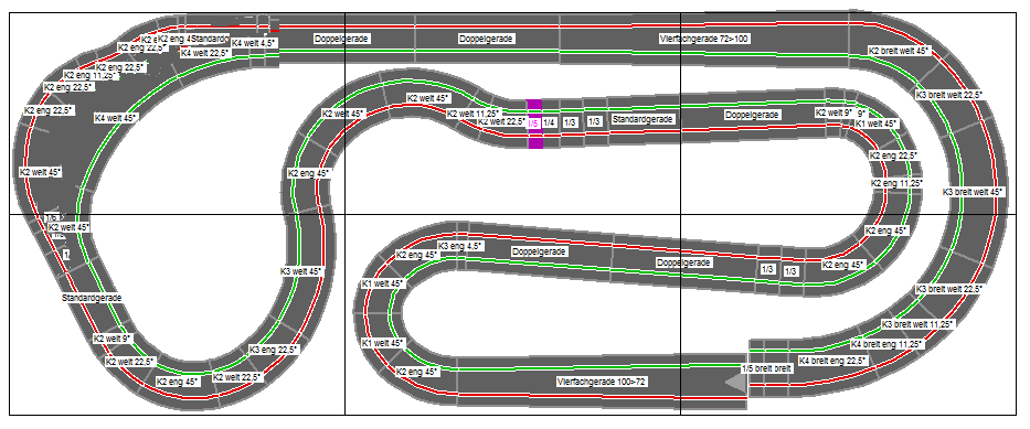 Eigentlich hatte ich ja noch vor, eine Kurve ohne Außenbande, dafür mit zwei Innenführungen zu bauen. Technisch funkionieren müsst es ja, aber ich brauch trotzdem zwei Innenleitplanken, d.h. die Spuren müssen weit auseinanderliegen, außerdem eine große Driftzone nach außen... ganz wirr und braucht auch Platz. Nä, ich machs ganz konventionell.